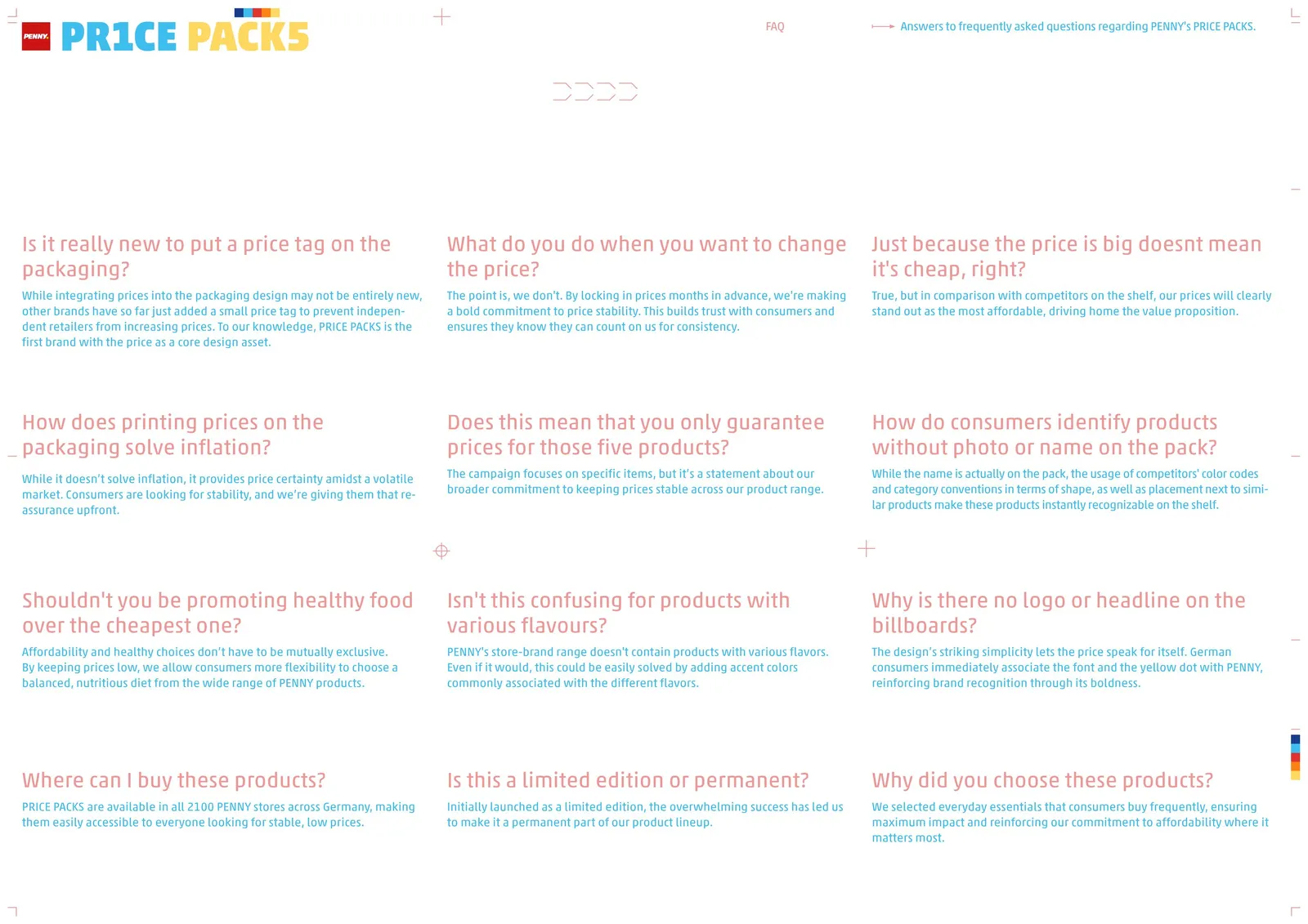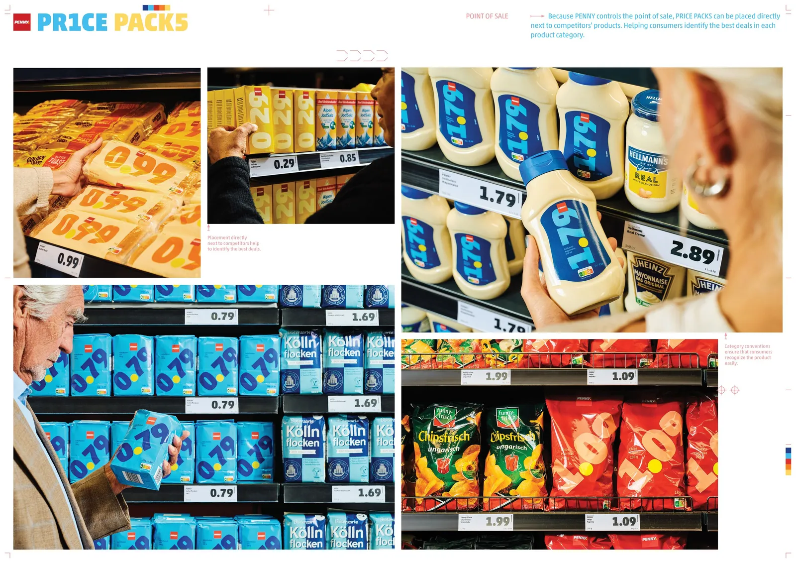 A pesar de la radicalidad del planteamiento, Price Packs no rompe con la identidad de PENNY. Elementos clave como el característico punto amarillo y la tipografía Akko se mantienen como anclajes visuales.