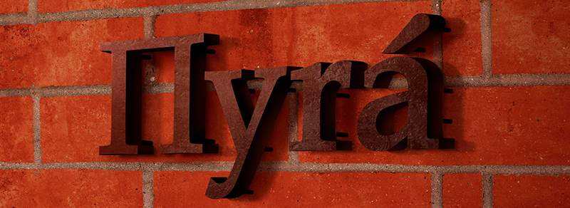 El logotipo de Πyrá es un wordmark a medida que combina curvas suaves —que evocan la redondez de las tartas cretenses— con cortes afilados que remiten a las marcas hechas por herramientas calientes, tallas en madera o hierros al rojo vivo.