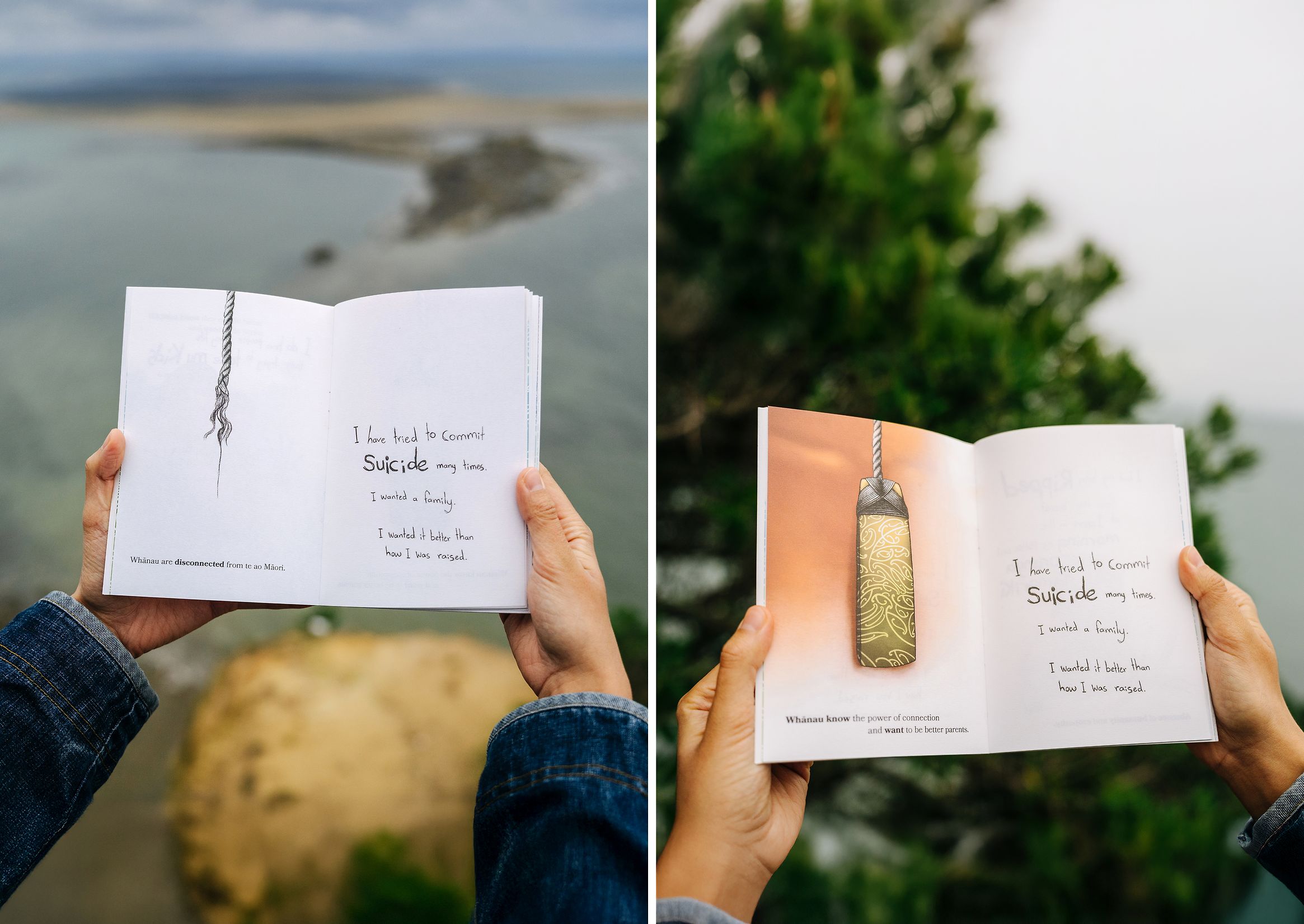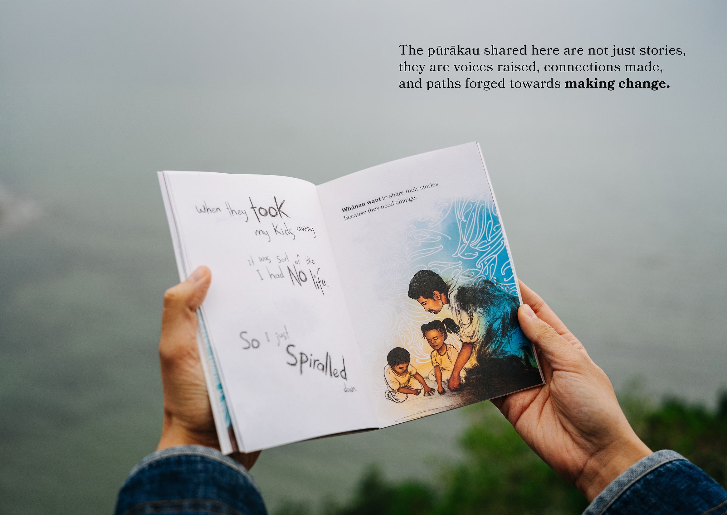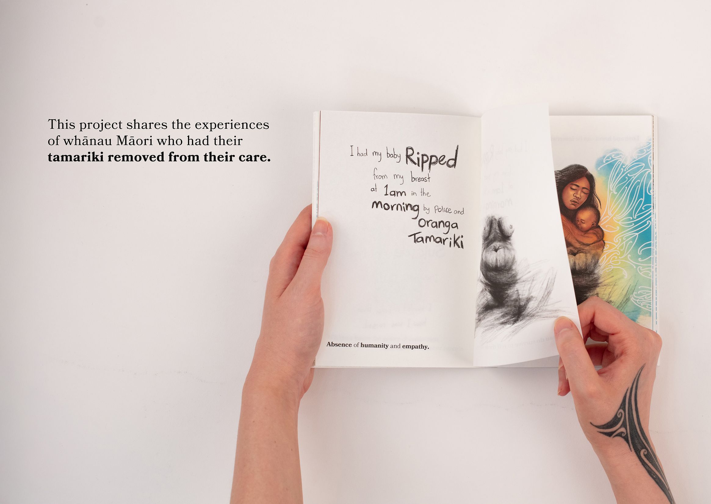 El trabajo no romantiza el trauma; lo contextualiza y lo honra. Cada página del libro está diseñada para acompañar, no para interpretar. Las ilustraciones están acompañadas por citas literales de los wānanga, que capturan la voz real de las familias. Este enfoque evita que la investigación se convierta en datos fríos y la transforma en narración viva, en un diálogo visual que eleva, reconoce y legitima la experiencia vivida.