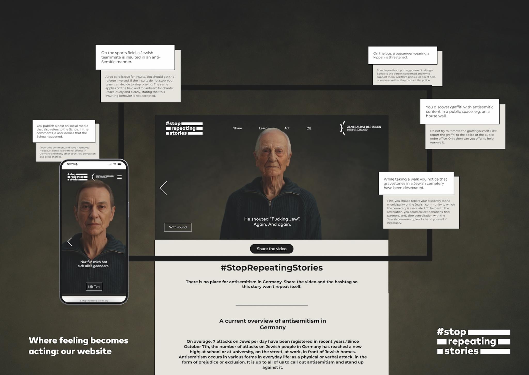 Uno de los grandes aciertos de la campaña es no quedarse solo en la emoción. El proyecto se completa con un microsite específico: stop-repeating-stories.org, donde se ofrecen recomendaciones sencillas y accesibles para actuar contra el antisemitismo en el día a día. Consejos, recursos compartibles, materiales descargables y sharepics convierten la indignación en pequeños gestos concretos.