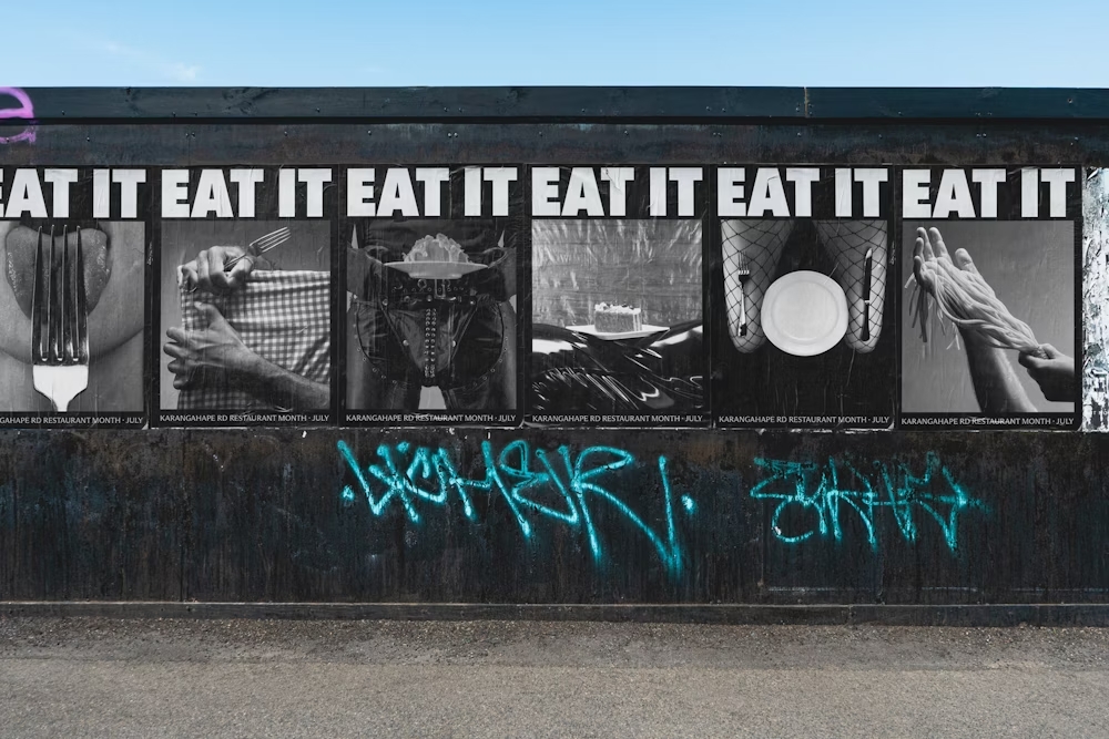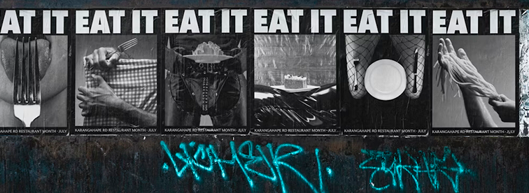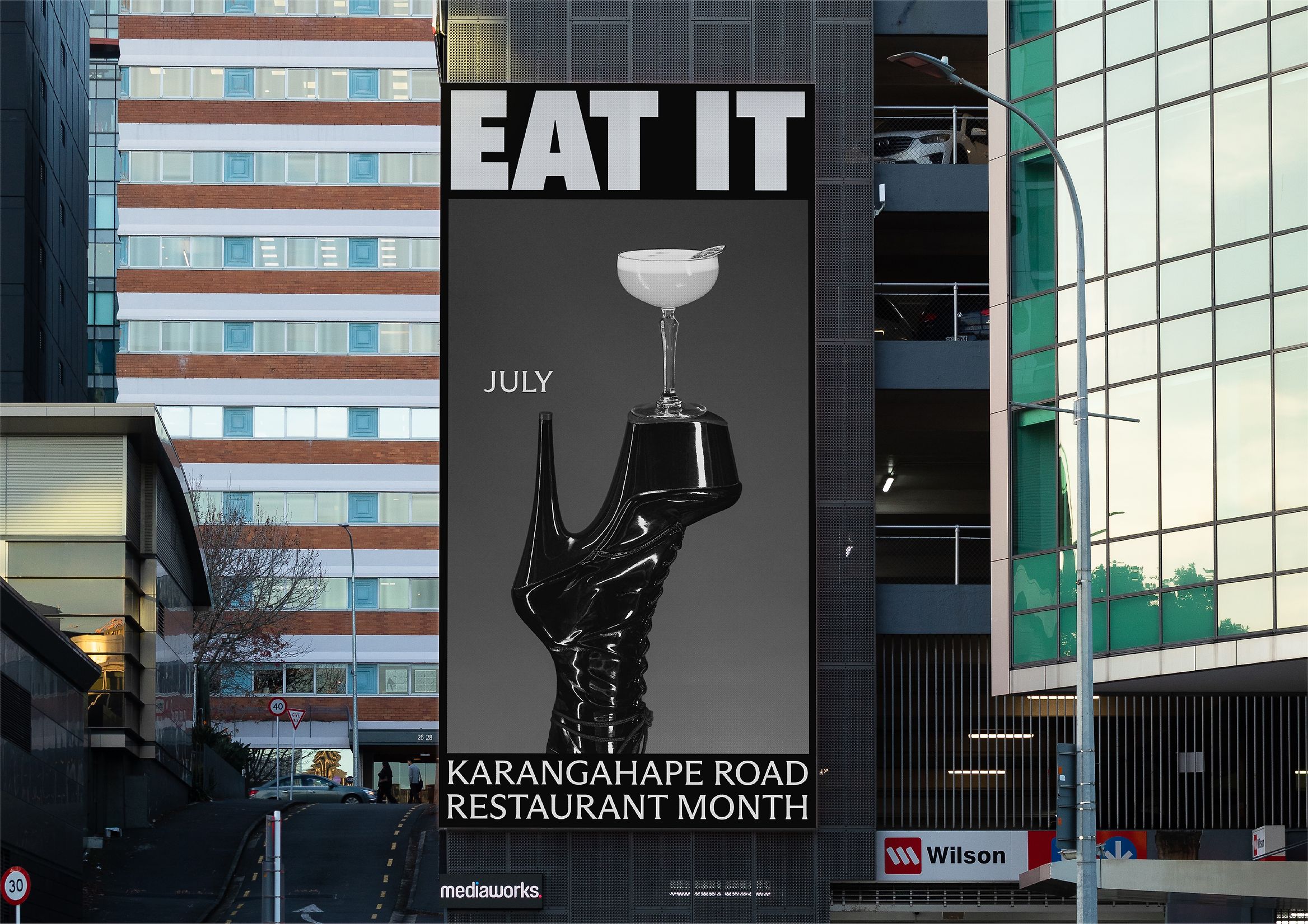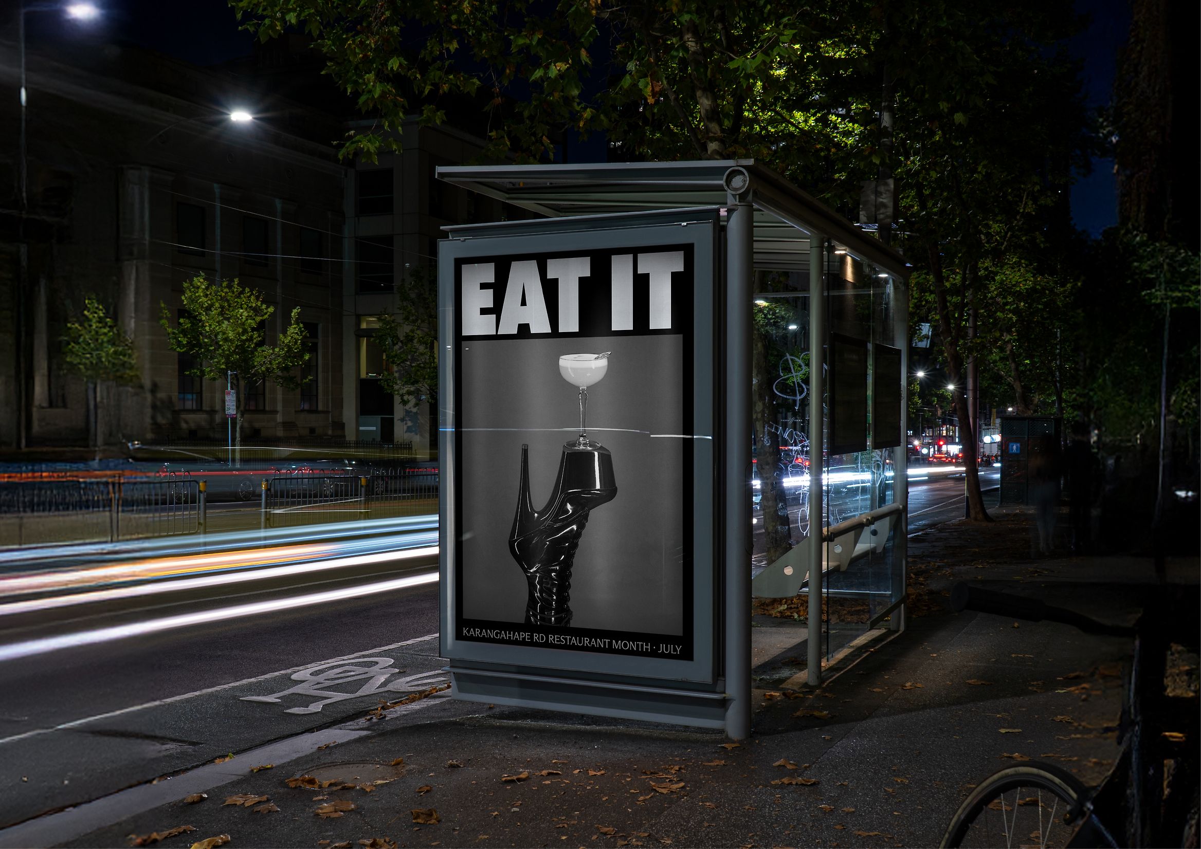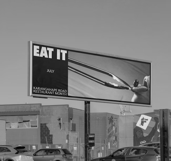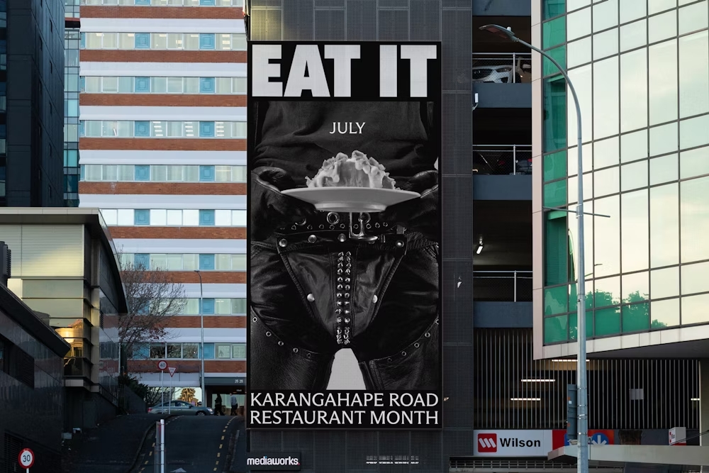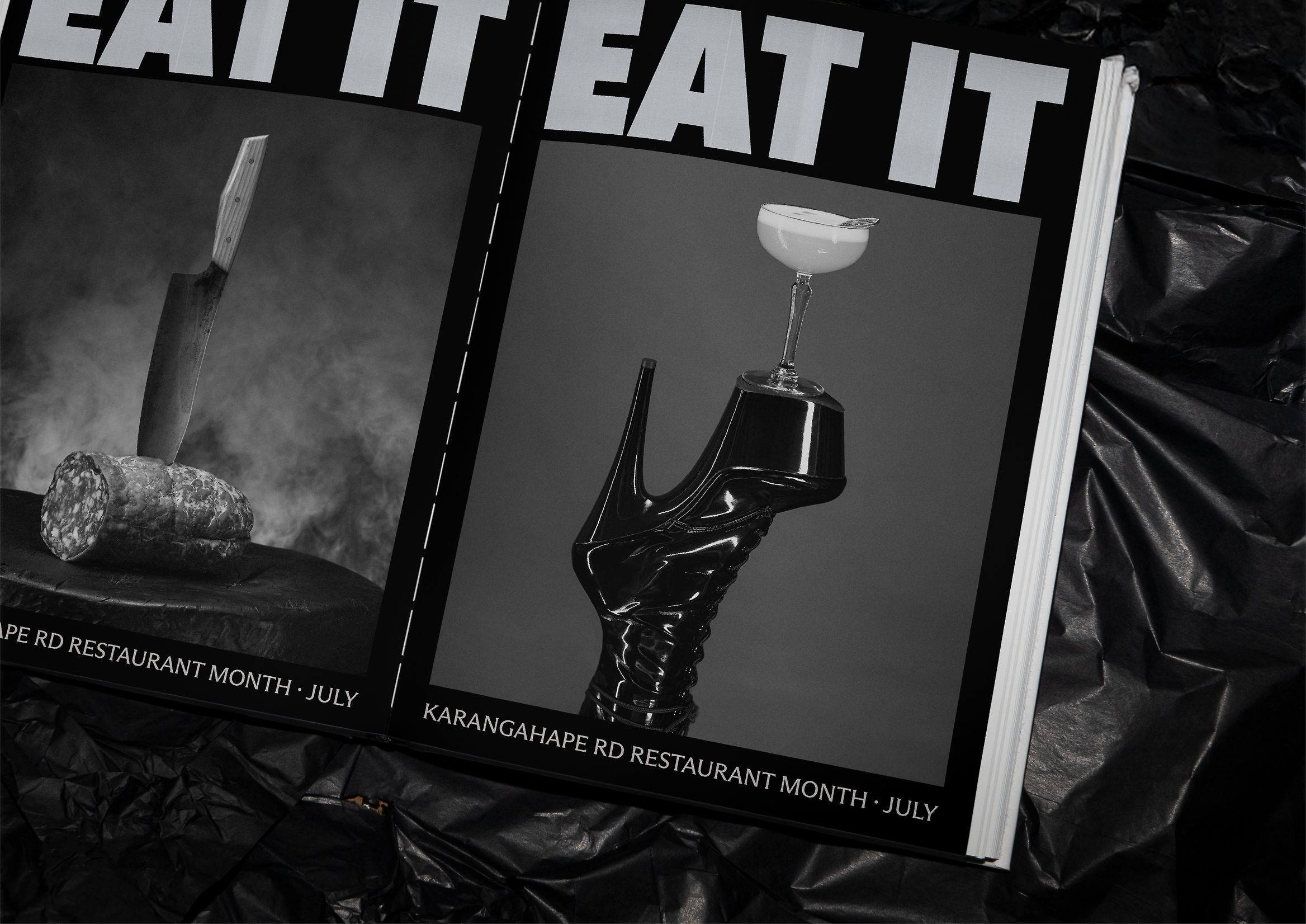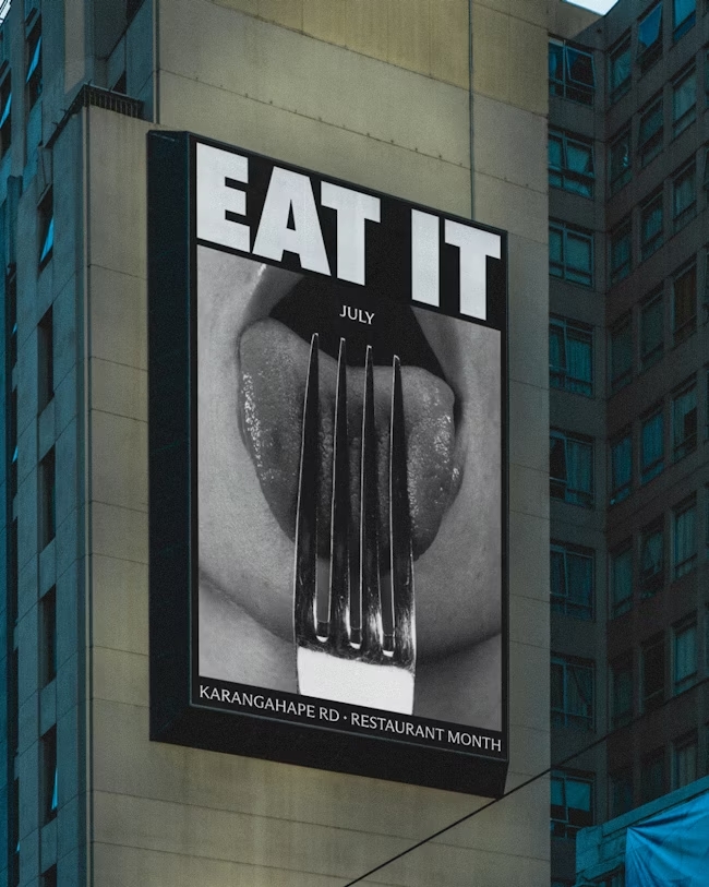 El reto del proyecto era enorme: crear una campaña que capturara esa esencia sin convertirla en cliché. Como explicó el propio estudio, “The time had come for Karangahape Road’s take on ‘restaurant month’. So we created EAT IT — an ode to the road’s provocative attitude, powerful sexuality and one-of-a-kind gastronomical offering.”