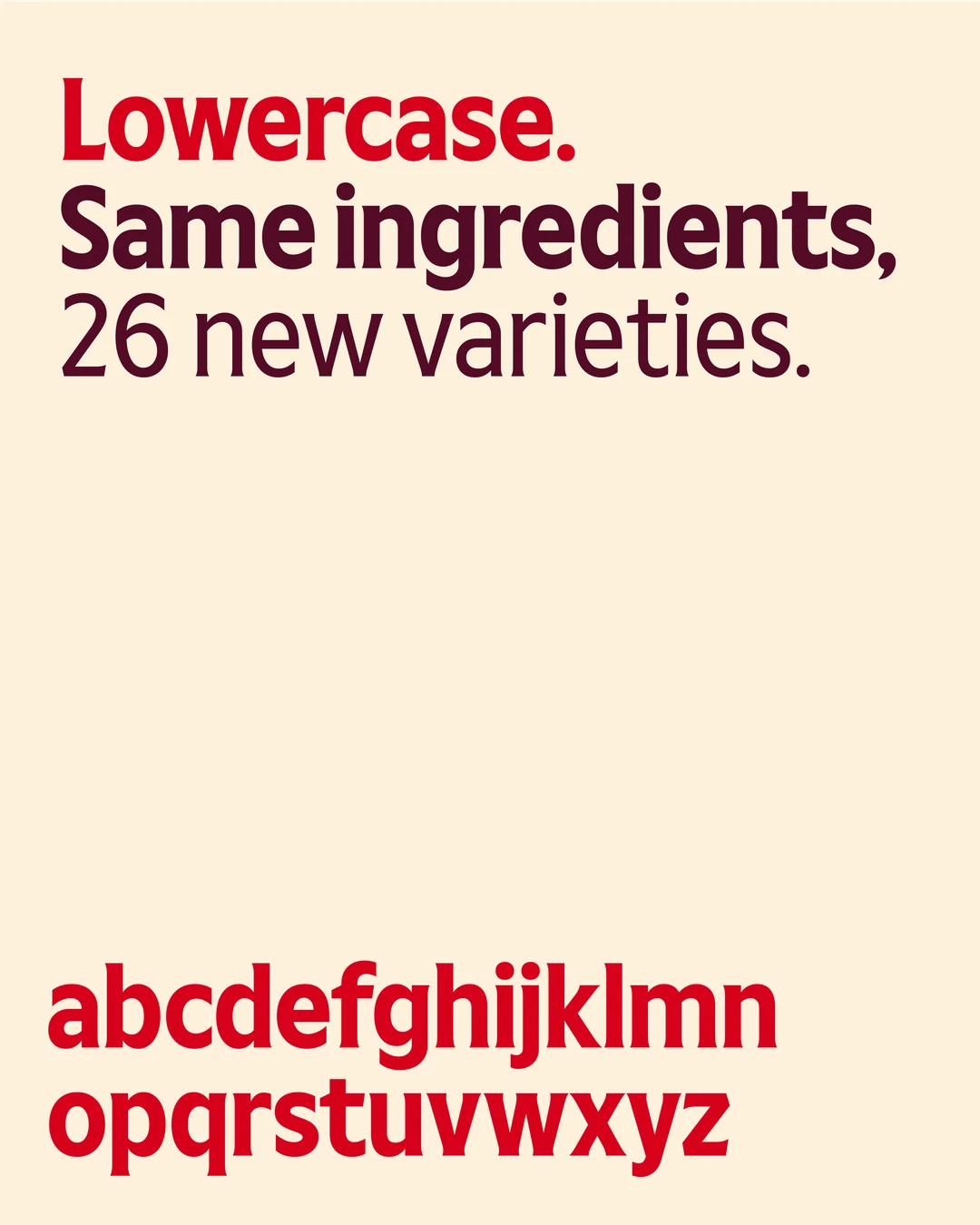 Uno de los hitos más importantes del proyecto es la expansión del tipo original con una nueva minúscula, numerales y signos de puntuación. Por primera vez en su historia, Heinz dispone de una tipografía completa capaz de modular el tono de su comunicación.