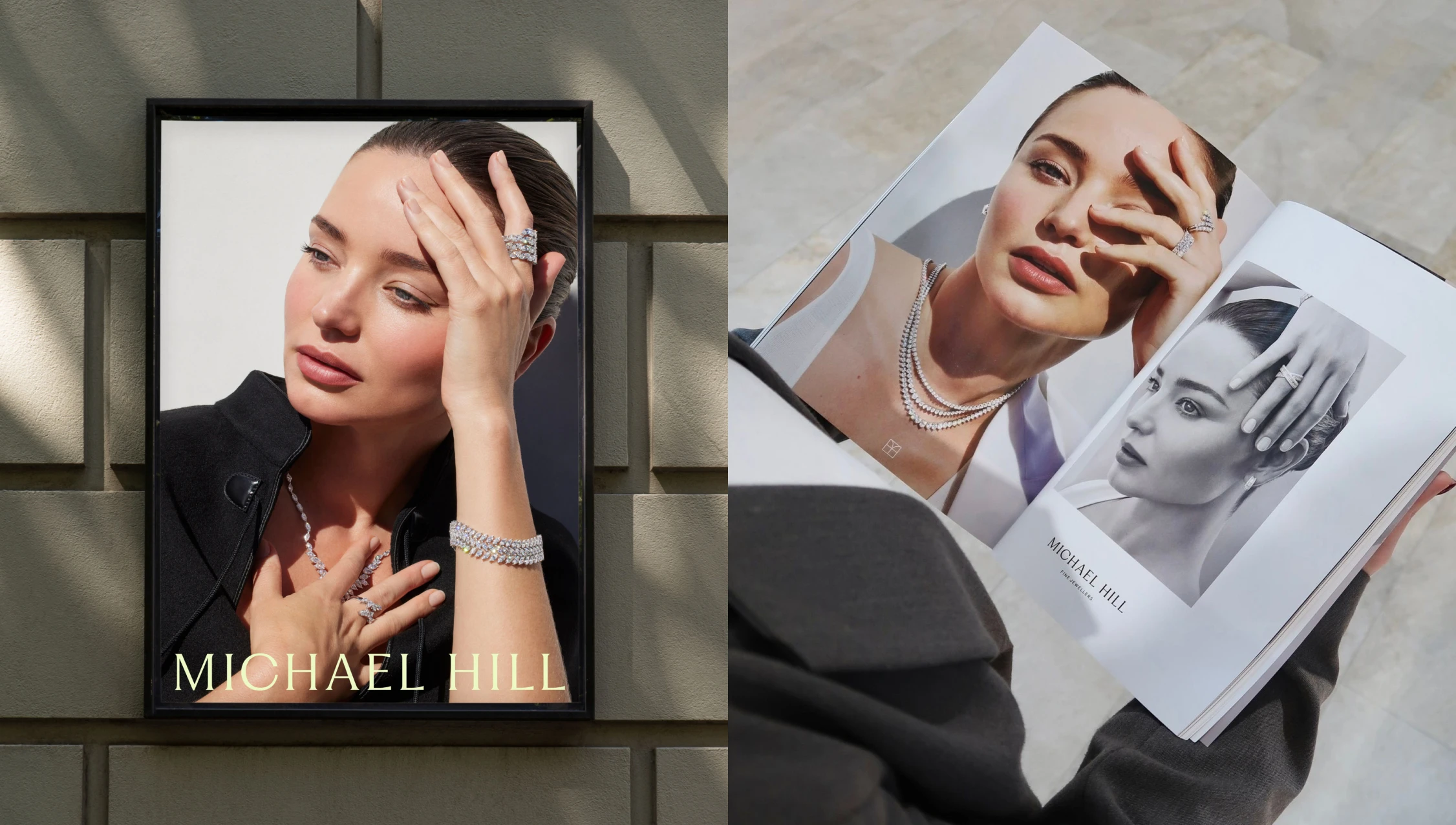 La dirección de arte fotográfica, protagonizada por Miranda Kerr, refuerza el carácter emocional del rebranding: imágenes con luz natural, texturas suaves y un tono editorial que aleja a Michael Hill del entorno del retail y la acerca al universo del diseño visual de moda.