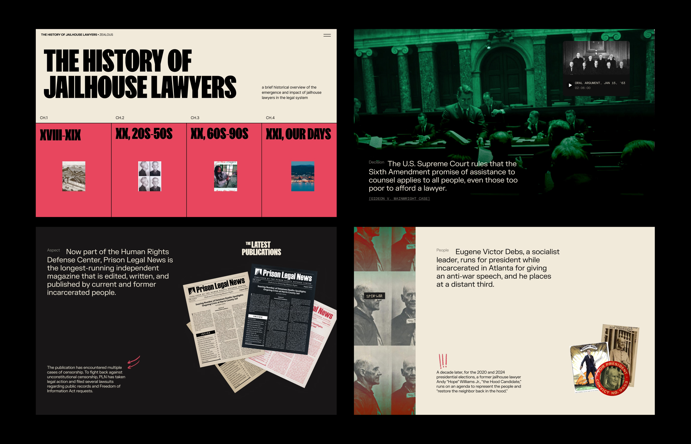 La Jailhouse Lawyers Initiative disponía de una enorme cantidad de información: fechas, casos, hitos jurídicos, biografías, citas, recursos académicos… Una narrativa rica pero difícil de consumir para el gran público. El encargo a Tubik fue claro: crear una sección dentro del sitio existente que funcionara como un recorrido histórico interactivo, sin abrumar al usuario ni romper el diseño global de la web.