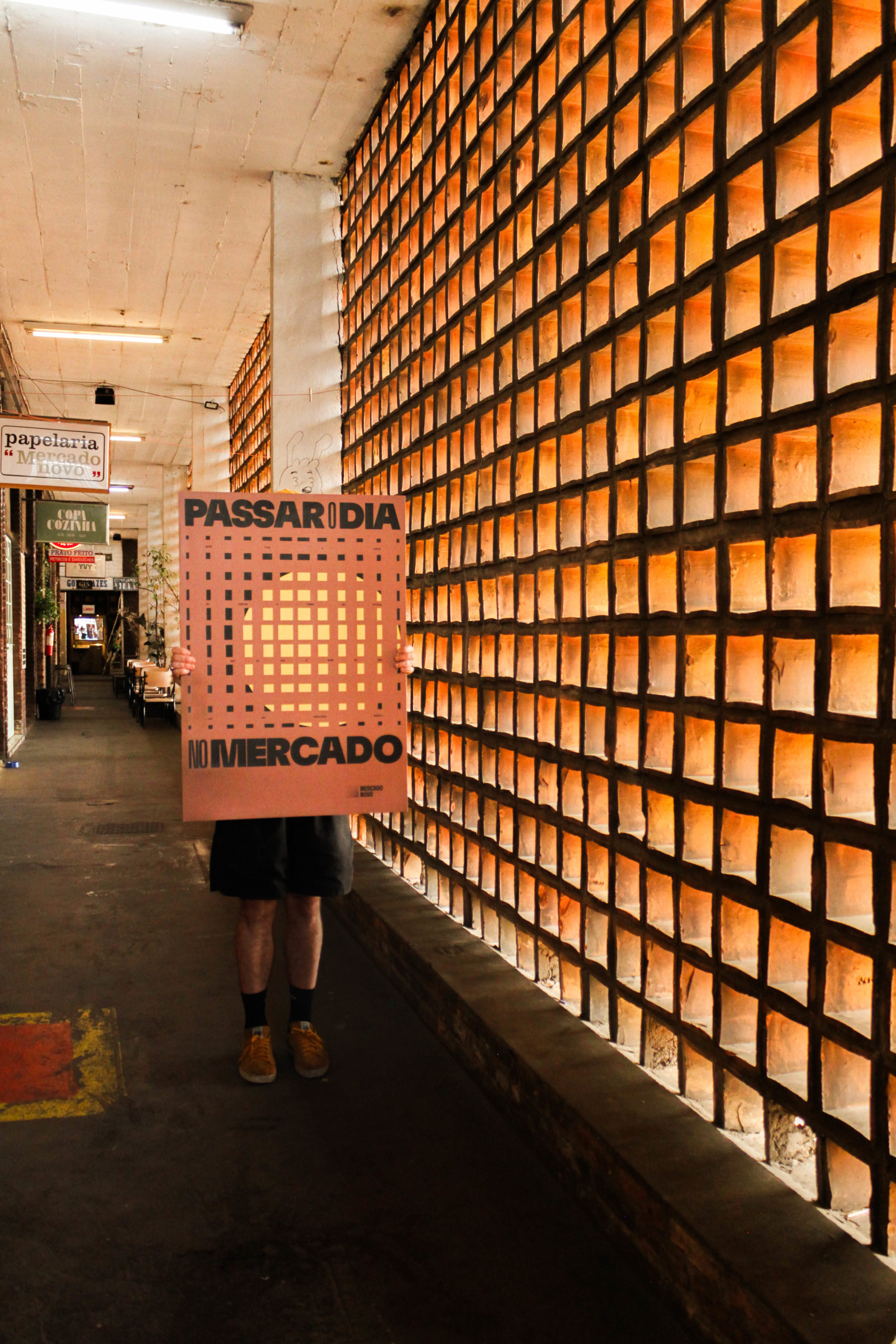 El equipo de Greco Design enfrentó un reto complejo: capturar la energía contemporánea de un espacio donde coexisten gastronomía, arte, música y diseño, sin perder la memoria de su pasado. La respuesta nació en los cobogós, los característicos bloques perforados de cerámica que forman la fachada del edificio. Estos elementos, típicos de la arquitectura brasileña, generan una danza de luces y sombras a lo largo del día. Esa geometría cambiante se convirtió en la esencia del nuevo sistema visual: un patrón que evoluciona con el tiempo, como lo hace el propio mercado.
