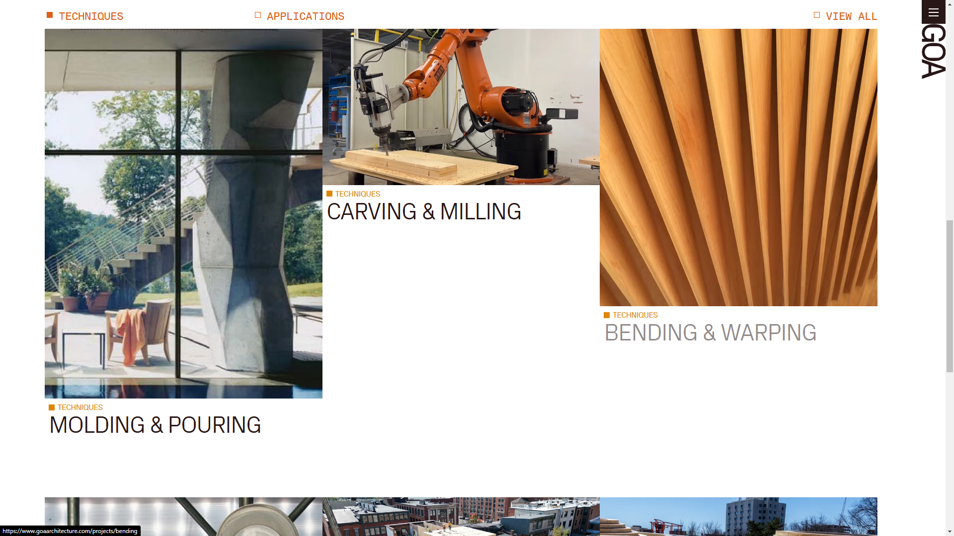 El diseño del sitio emplea imágenes de fondo de gran tamaño que dominan visualmente cada sección, creando una inmersión completa en los proyectos arquitectónicos de la firma. Además, la disposición horizontal del contenido es inusual, pero efectiva, lo que refuerza la identidad creativa y única de GOA Architecture. Esta estructura invita al usuario a navegar lateralmente a través de un menú horizontal minimalista, que organiza la información de manera poco convencional pero clara.