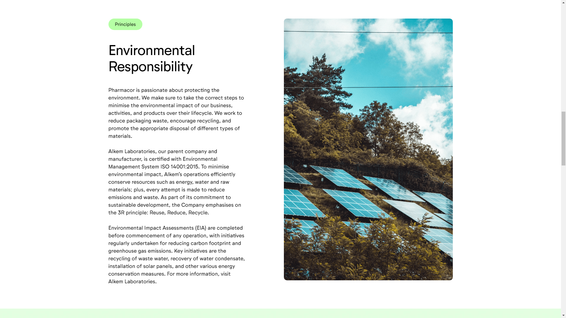 La paleta de colores del sitio, que incluye HEX #186F64 y HEX #0F0F10, establece una atmósfera fresca y profesional. El verde oscuro simboliza la naturaleza y la sostenibilidad, mientras que el negro proporciona un fondo elegante que permite que los elementos visuales resalten. Esta combinación de colores refuerza el mensaje del sitio sobre la importancia de la tecnología biológica en un mundo sostenible.