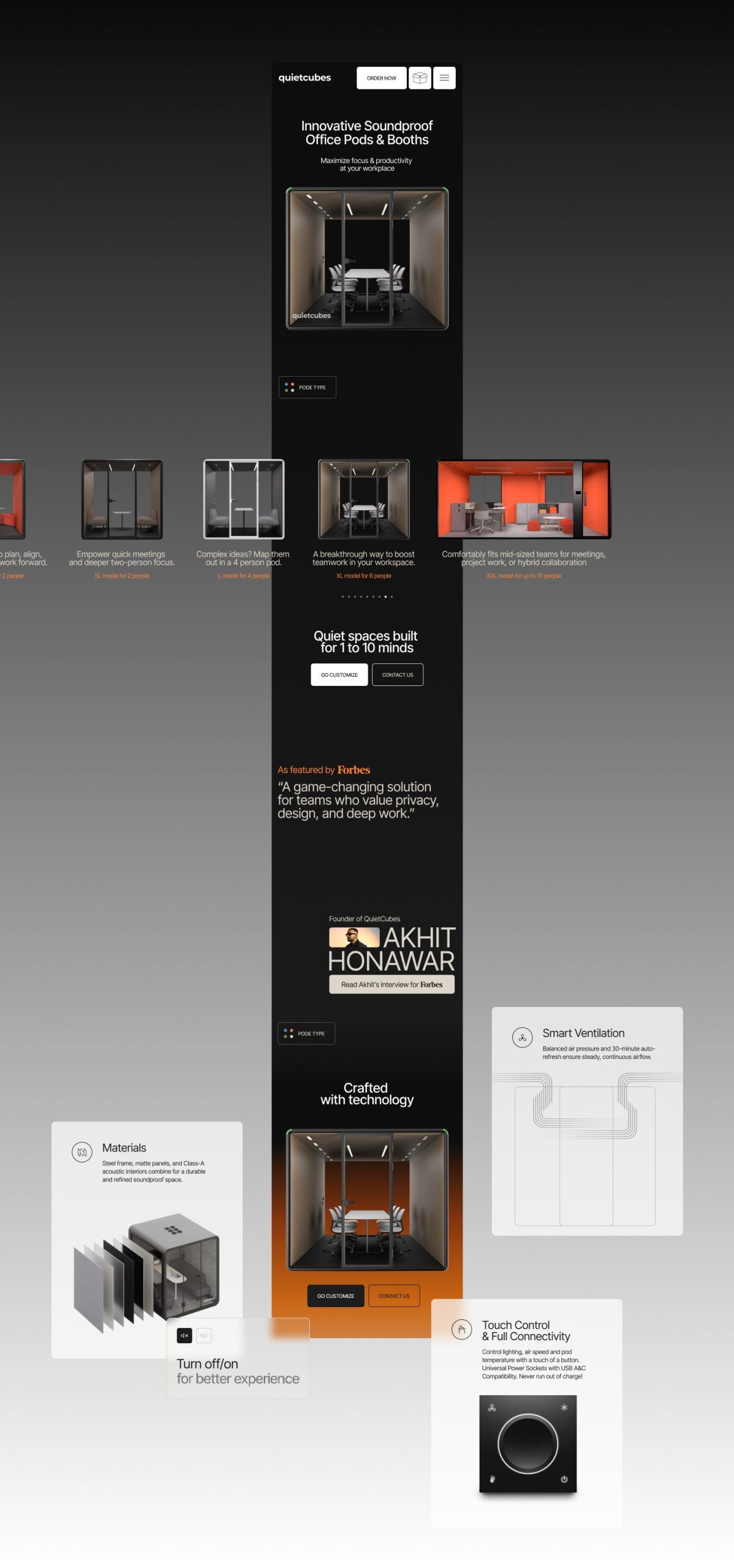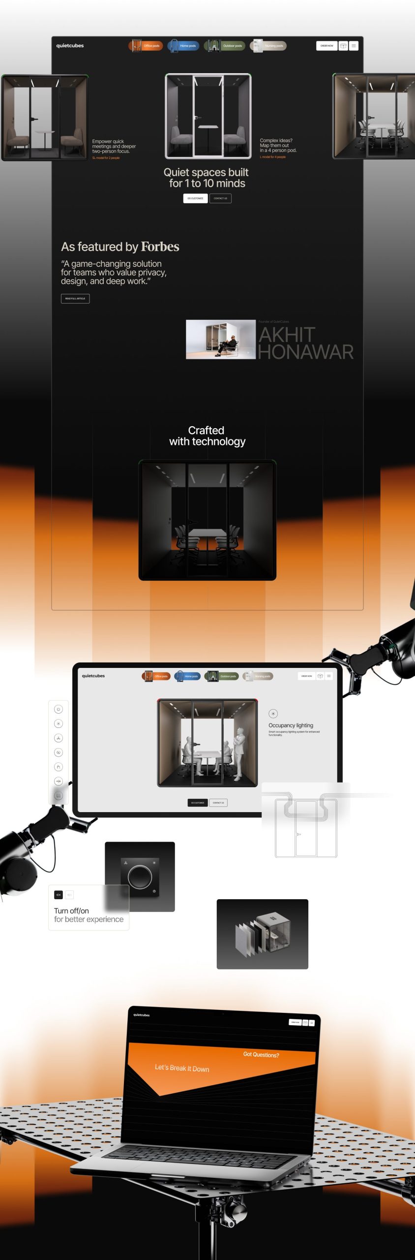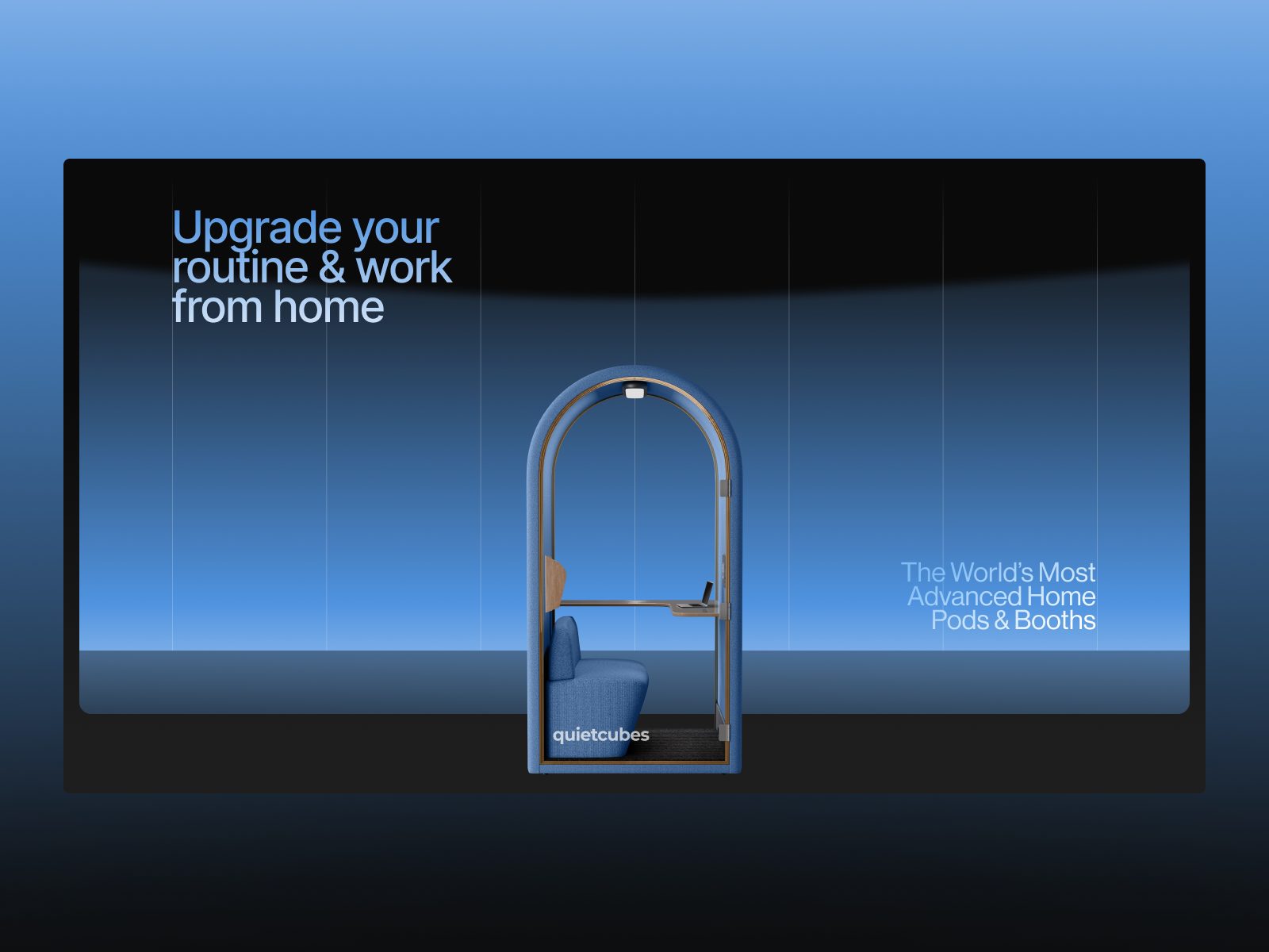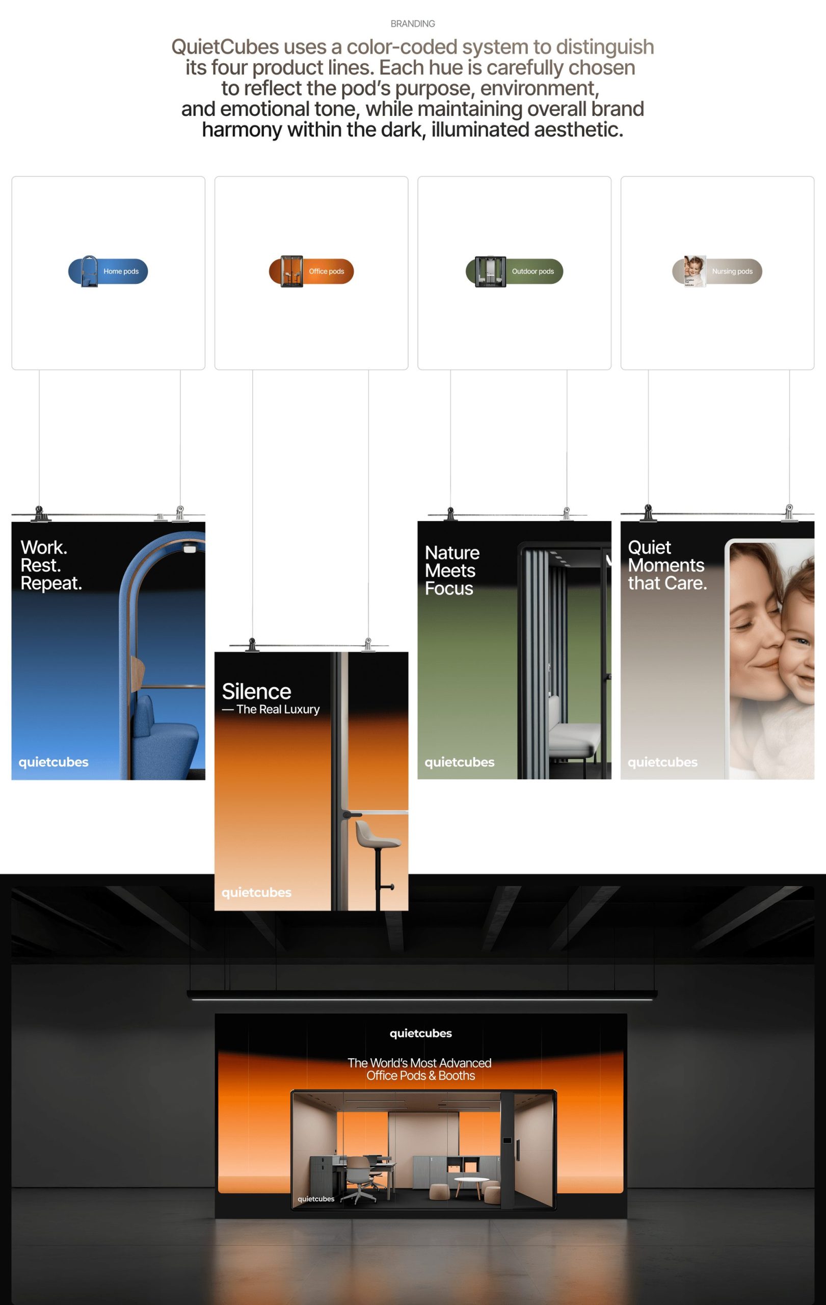 La llum és l’eix conceptual del projecte. La web gira entorn de com la il·luminació revela superfícies, textures i volums. Aquesta narrativa visual connecta directament amb el producte: cabines que, en l’àmbit físic, garanteixen claredat mental enmig del soroll. Aquí, la navegació digital reprodueix aquesta transició —ens movem literalment de la foscor a l’enfocament— generant una metàfora directa entre marca i experiència.