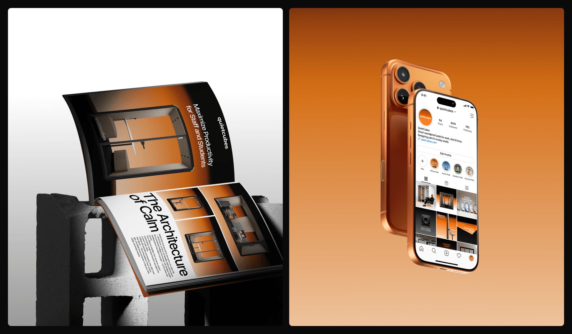 La identitat gràfica no competeix amb el producte; l’acompanya. La textura del so transformada en llum, la quietud com a recurs visual, l’ordre com a fil narratiu… Tot està pensat per reforçar el missatge principal: un espai creat per reconnectar amb la concentració, la calma i la productivitat.
