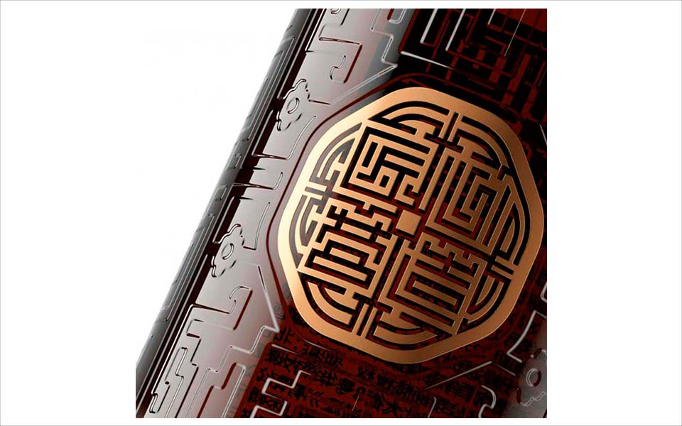 La major part del packaging de l’ampolla està dominat per un entramat tradicional xinès gravat directament al vidre.