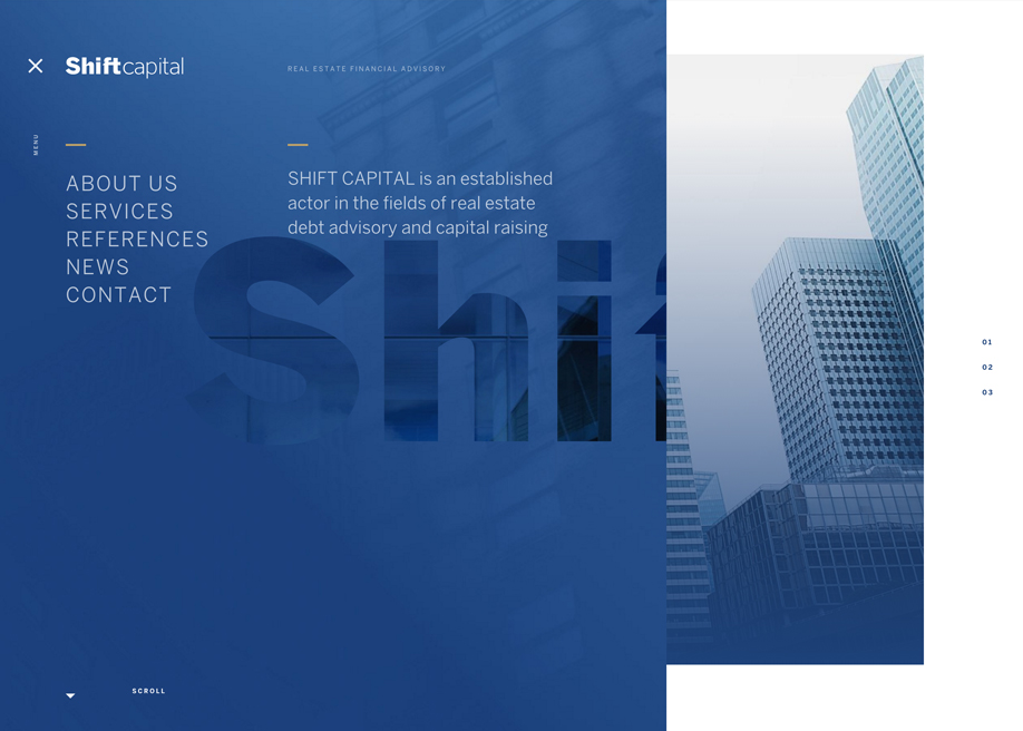 Shift Capital és una empresa especialitzada en assessorament immobiliari i inversions. Destaquem el menú de navegació, molt impactant, i les transicions entre seccions, molt treballades. Un exemple clar que, fins i tot amb un producte aparentment “avorrit”, com pot semblar el disseny web per a una empresa d’assessorament i inversions, es pot crear una experiència que capti l’atenció del client potencial.