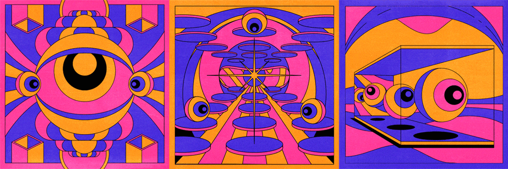 Tot i que la psicodèlia sovint s’inspira en la natura (pensa en els núvols multicolors i els bolets fosos de moltes composicions), la psicodèlia espacial consisteix a unir el futur i el passat. Es caracteritza per tècniques retro dels 90 com els patrons de disseny Memphis, els estils de dibuixos animats dels dissabtes al matí i colors que recorden el material escolar de Lisa Frank. I es barreja amb temes futuristes, com ara androides i naus espacials, paisatges vaporwave, entorns simulats i neó cyberpunk. Amb aquestes il·lustracions brillants i imaginatives, els dissenyadors del 2023 miren cap al futur tecnològic amb optimisme.