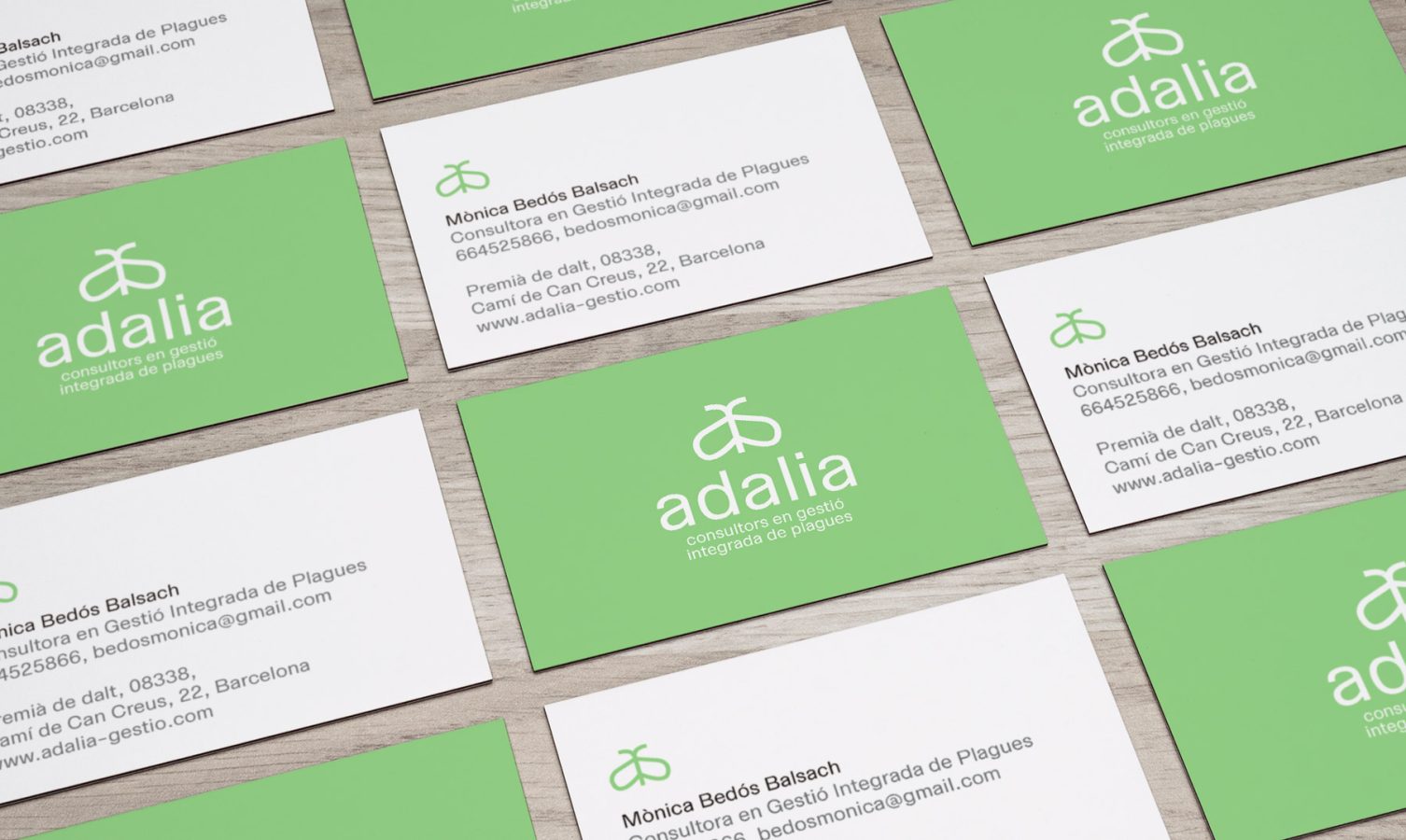 Disseny de la identitat corporativa per a Adalia, empresa especialitzada en gestió integrada de plagues amb mètodes naturals i respectuosos amb el medi ambient. El projecte desenvolupa un sistema visual que transmet equilibri ecològic, control i sostenibilitat, en sintonia amb el seu enfocament tècnic i ambiental.