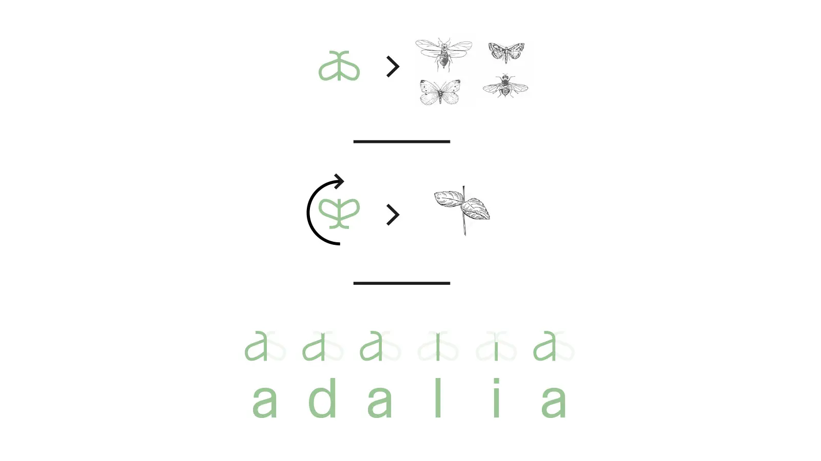 El símbol es crea a partir de les mateixes lletres que formen el nom “adalia”, generant un sistema coherent entre la marca i la seva representació gràfica. Aquesta integració reforça la identitat i hi afegeix una capa conceptual extra.