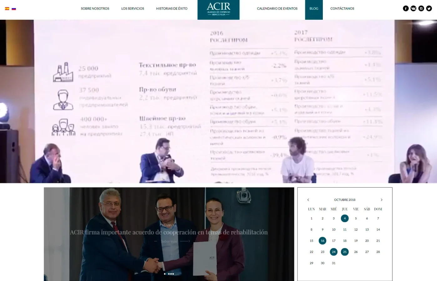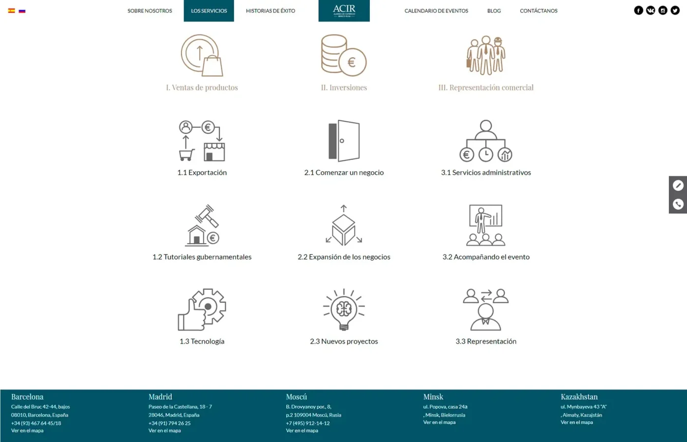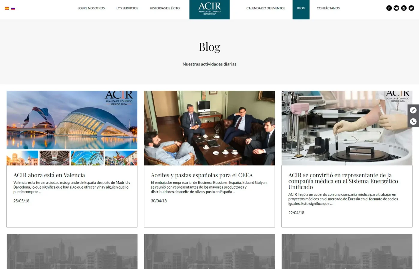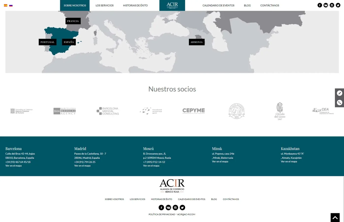 Disseny i desenvolupament web corporatiu per a ACIR, Alianza de Comercio Ibérico Rusa. El projecte es concep com una plataforma estructurada per afavorir les relacions comercials, la inversió i el desenvolupament de projectes entre Rússia i Espanya, organitzant la informació i els serveis de manera clara per donar suport a l’activitat institucional i empresarial.