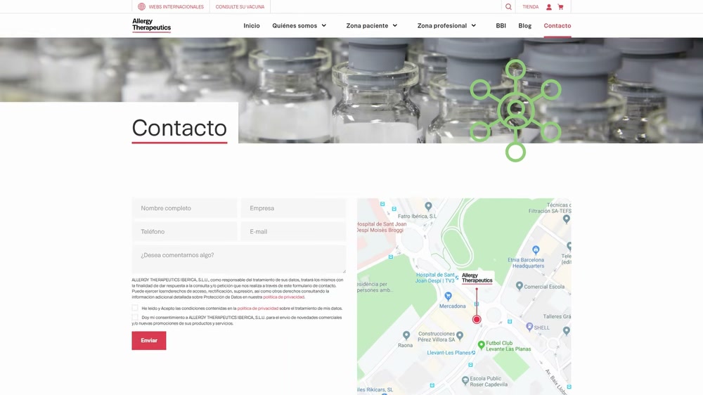 La secció de contacte centralitza les consultes a través del formulari i la ubicació física, facilitant l’accés a l’empresa des d’un entorn clar i funcional. Això reforça el vincle entre l’usuari i la marca en qualsevol etapa del recorregut digital.