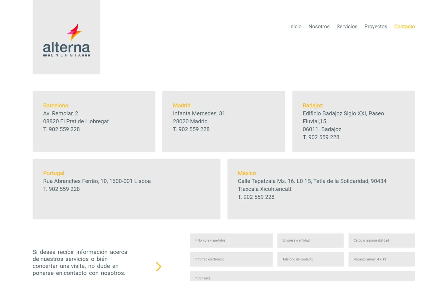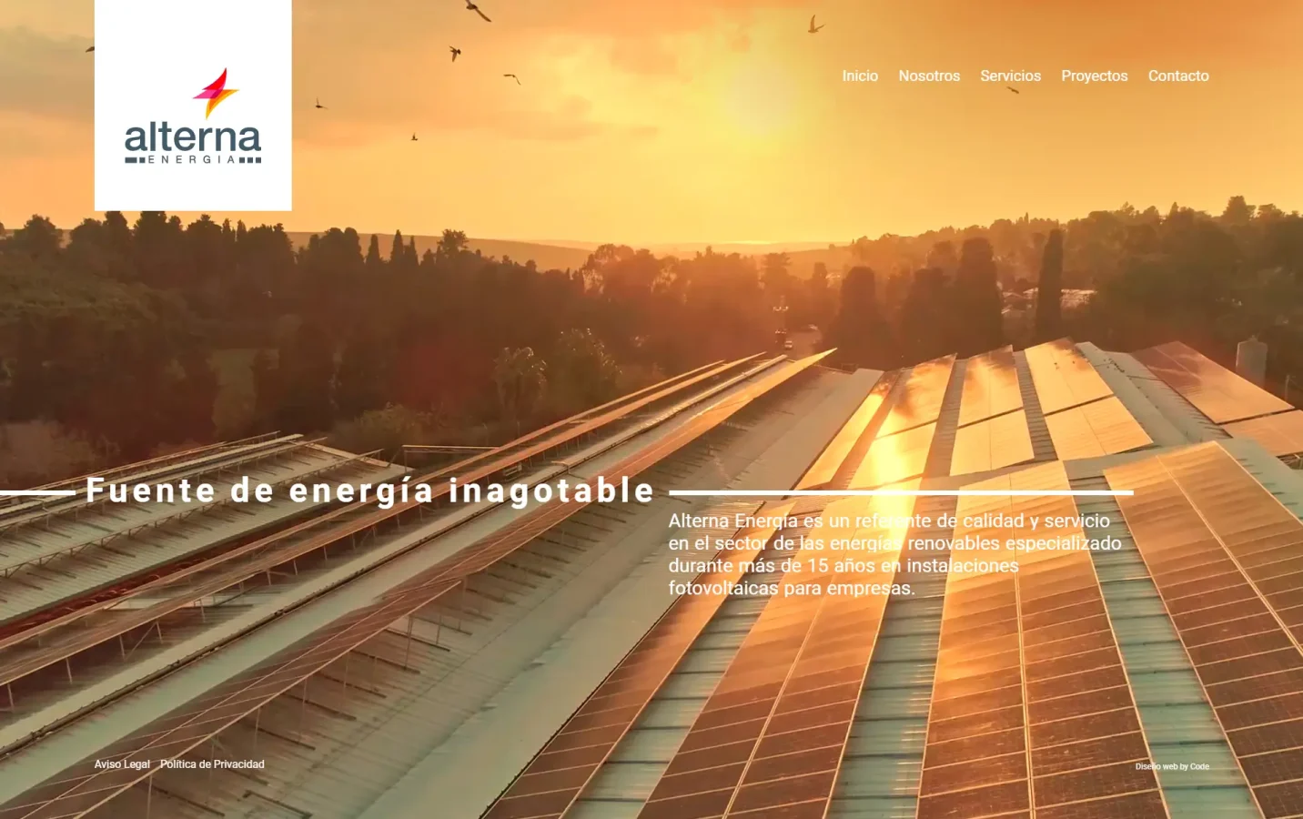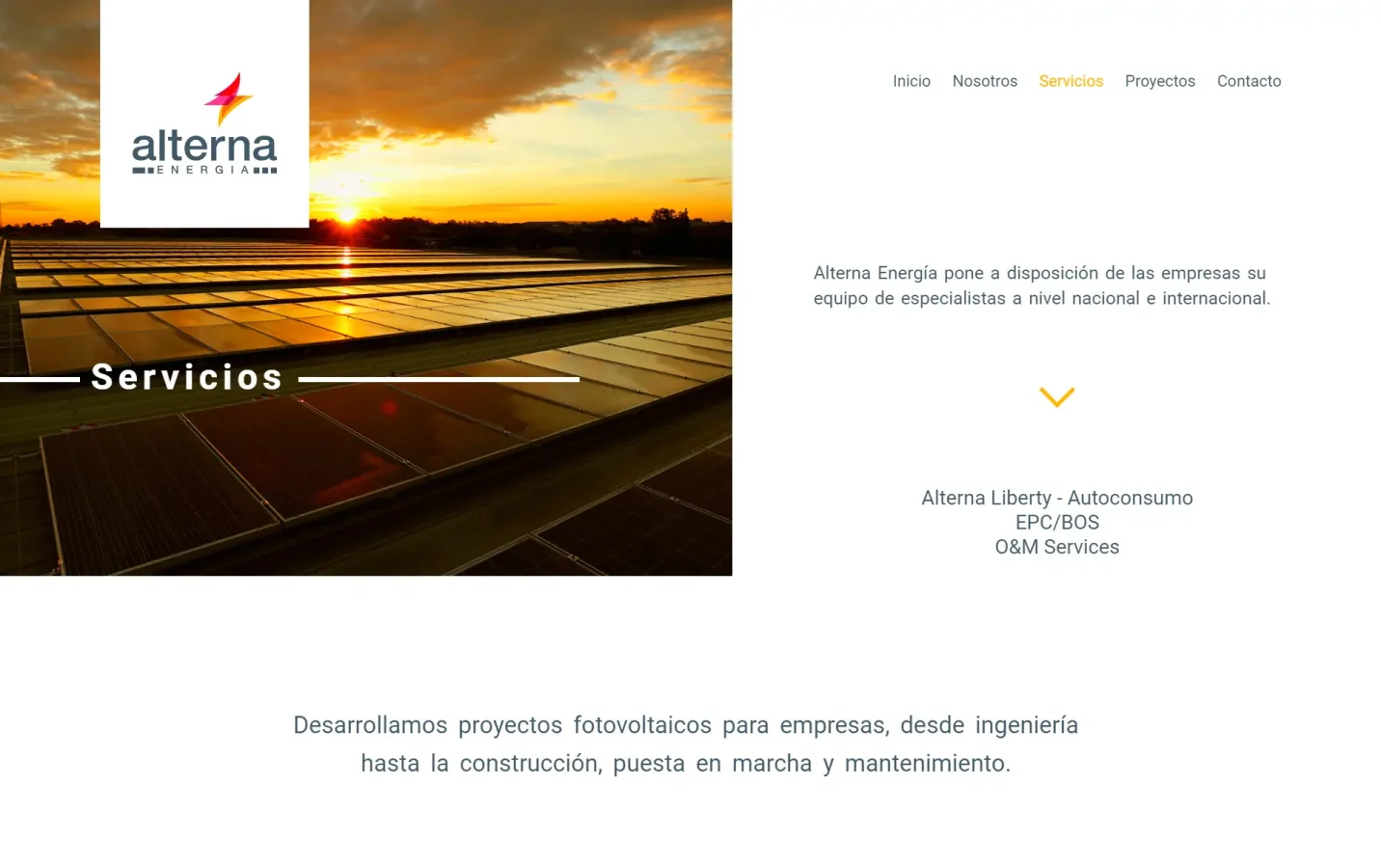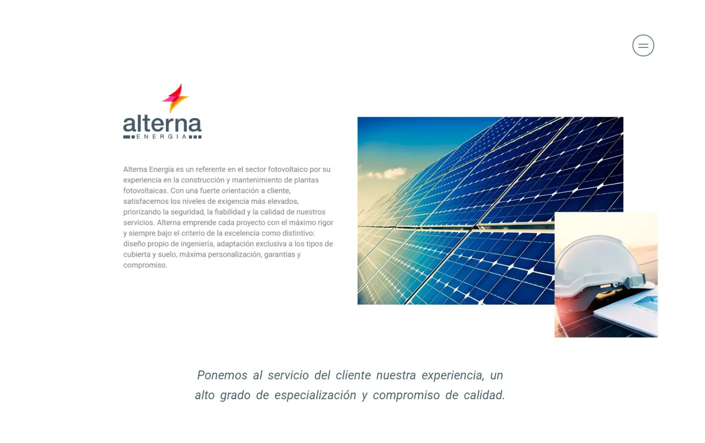 Disseny i desenvolupament web per a Alterna Energía, empresa especialitzada en la instal·lació i manteniment de plantes fotovoltaiques. El projecte crea un entorn visual amb vídeo a pantalla completa a la pàgina principal i una navegació dinàmica a les seccions internes, combinant contingut i elements flotants per mostrar l’activitat de manera clara i atractiva.