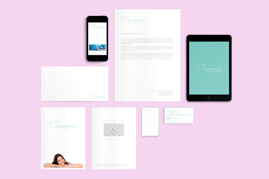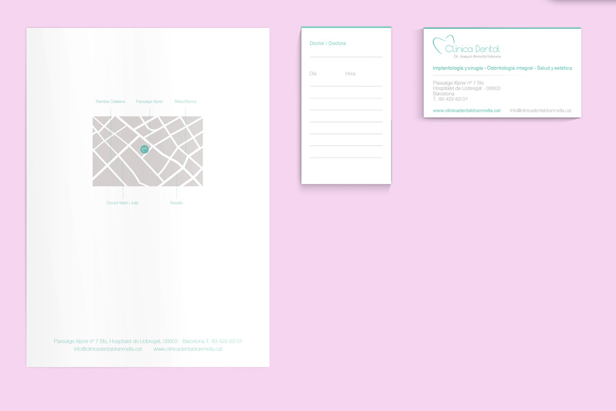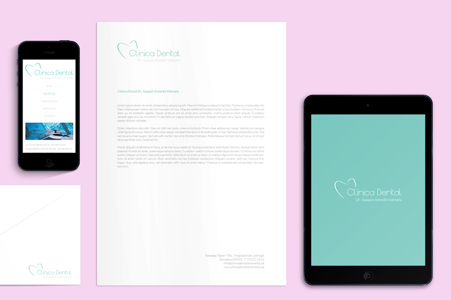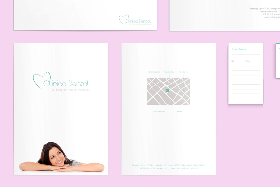 Disseny de la identitat visual per a la clínica dental del Dr. Anmella. El projecte estableix un sistema corporatiu integral pensat per transmetre netedat, precisió i confiança, alineant el llenguatge visual amb els estàndards del sector sanitari.