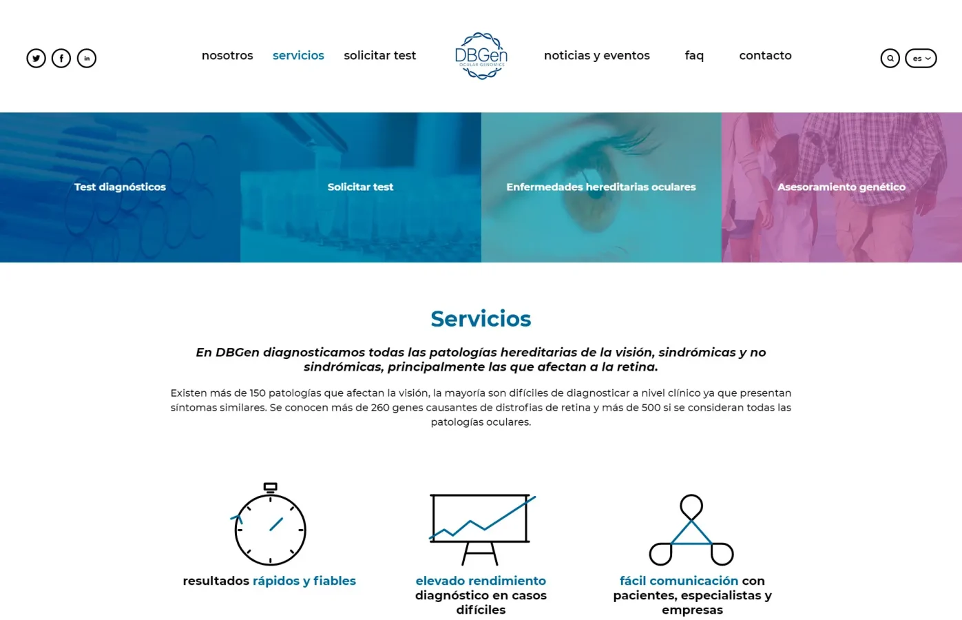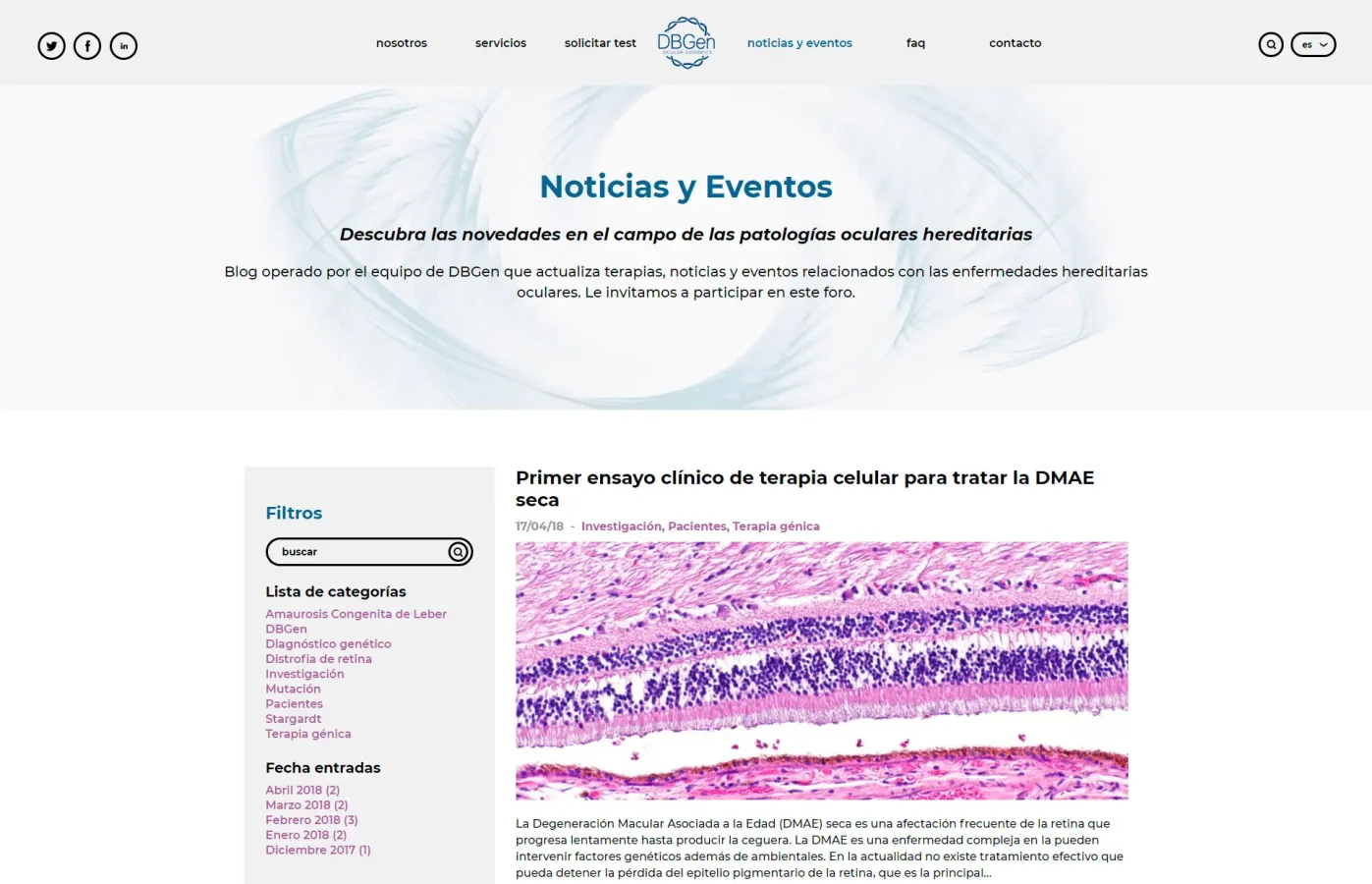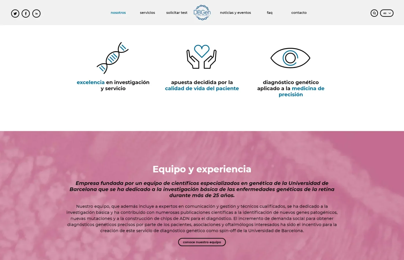 Disseny i desenvolupament web per a DBGen, empresa especialitzada en la recerca de malalties oculars genètiques. El projecte crea un entorn digital amb enfocament científic, on la claredat dels continguts es combina amb un ús mesurat d’animacions a la pàgina principal per afavorir la comprensió i la presentació de l’activitat investigadora.
