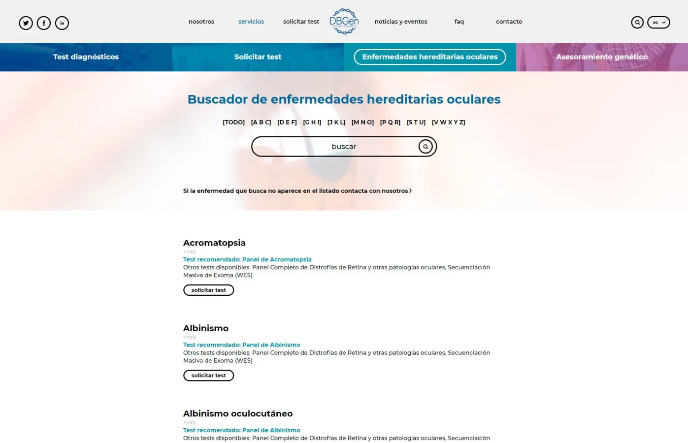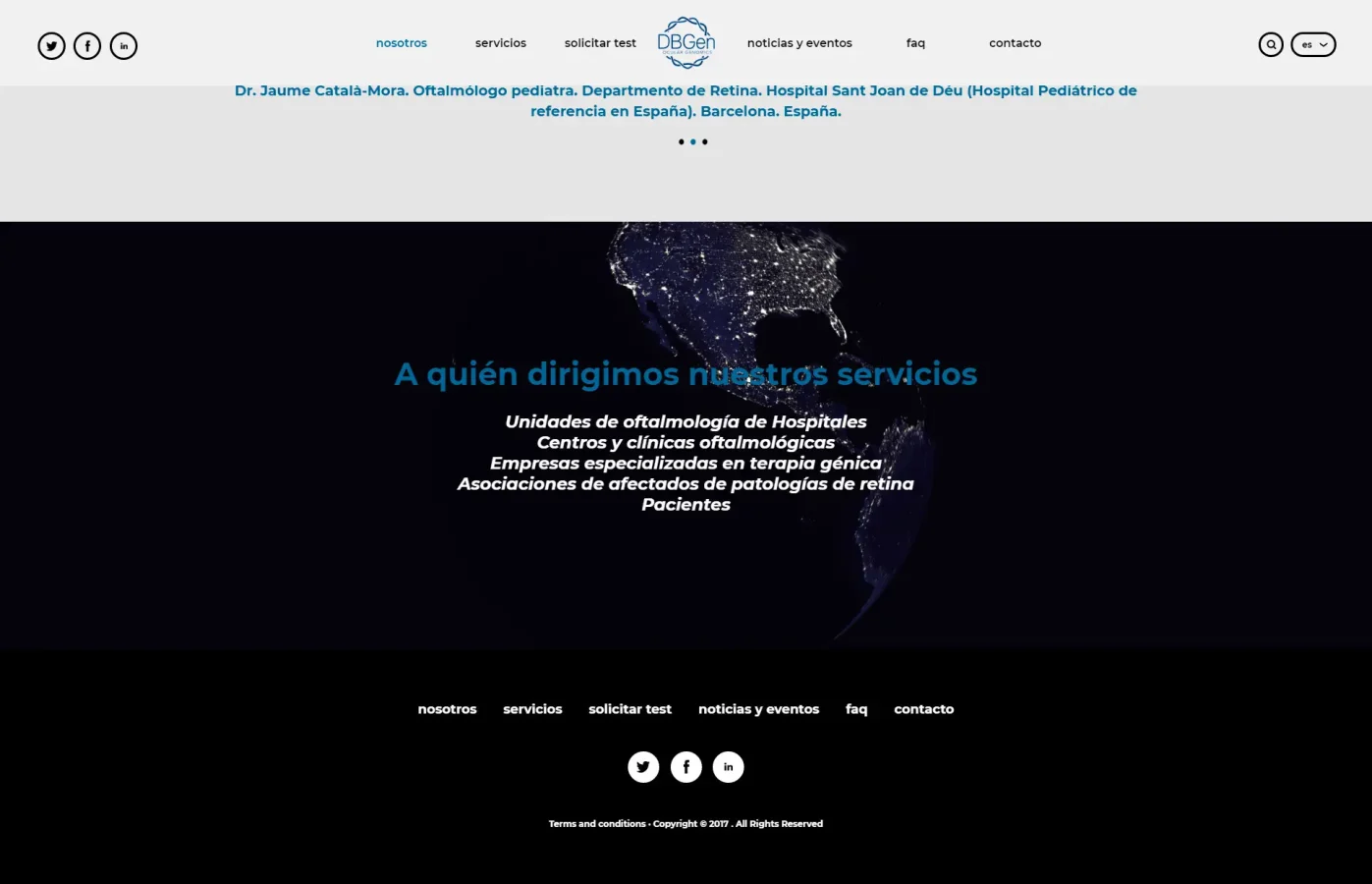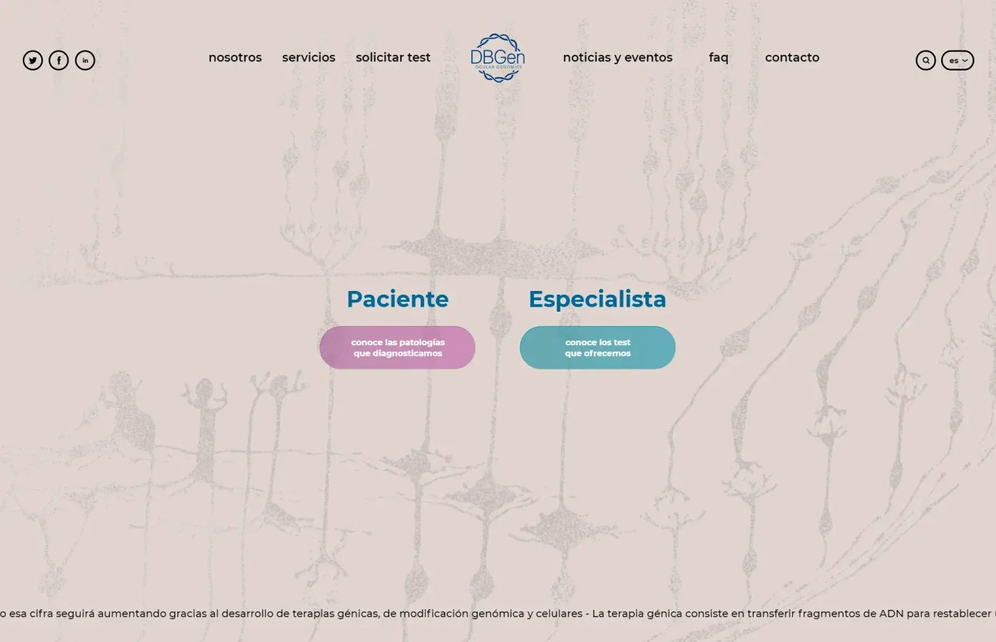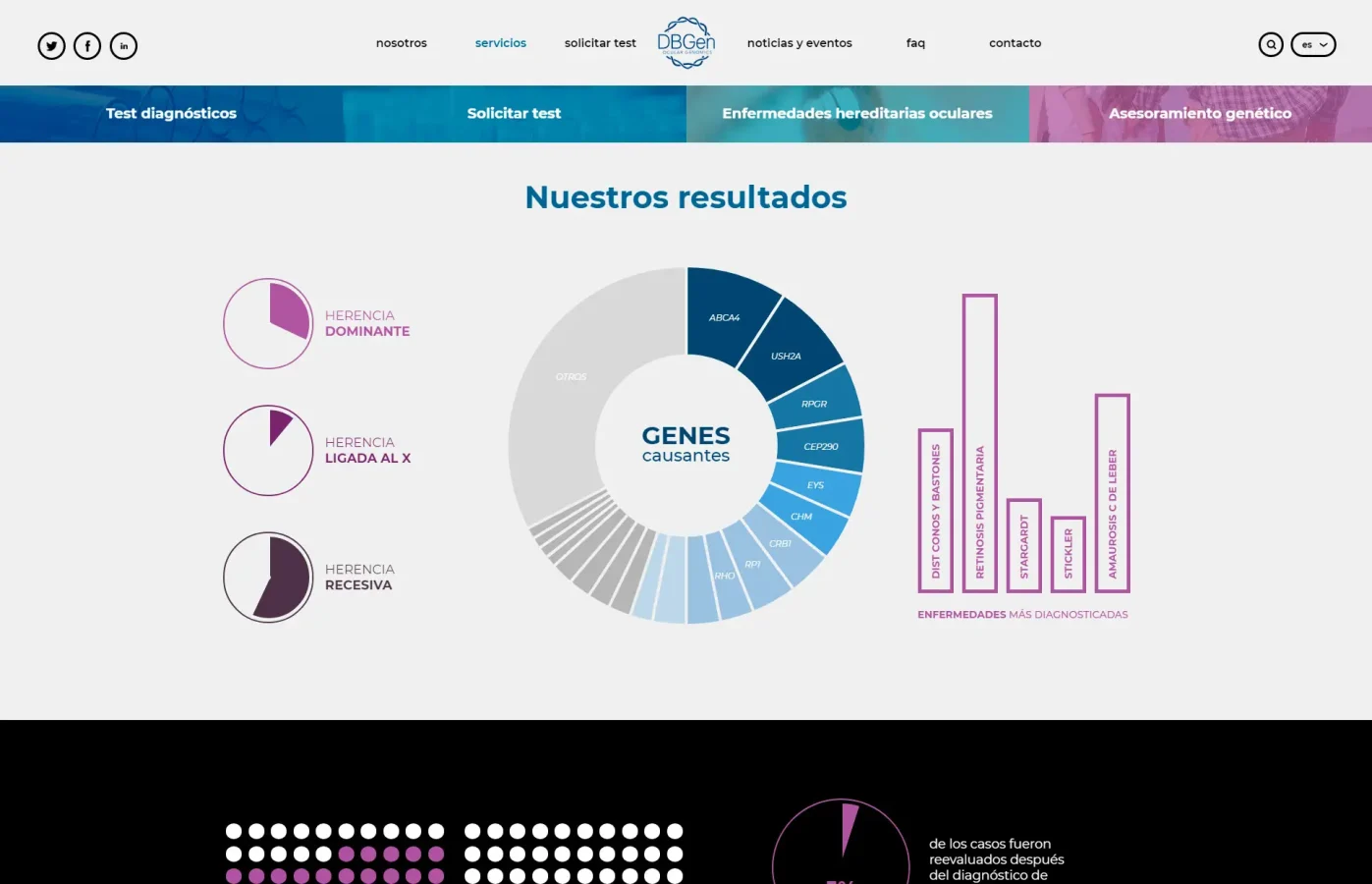 Disseny i desenvolupament web per a DBGen, empresa especialitzada en la recerca de malalties oculars genètiques. El projecte crea un entorn digital amb enfocament científic, on la claredat dels continguts es combina amb un ús mesurat d’animacions a la pàgina principal per afavorir la comprensió i la presentació de l’activitat investigadora.