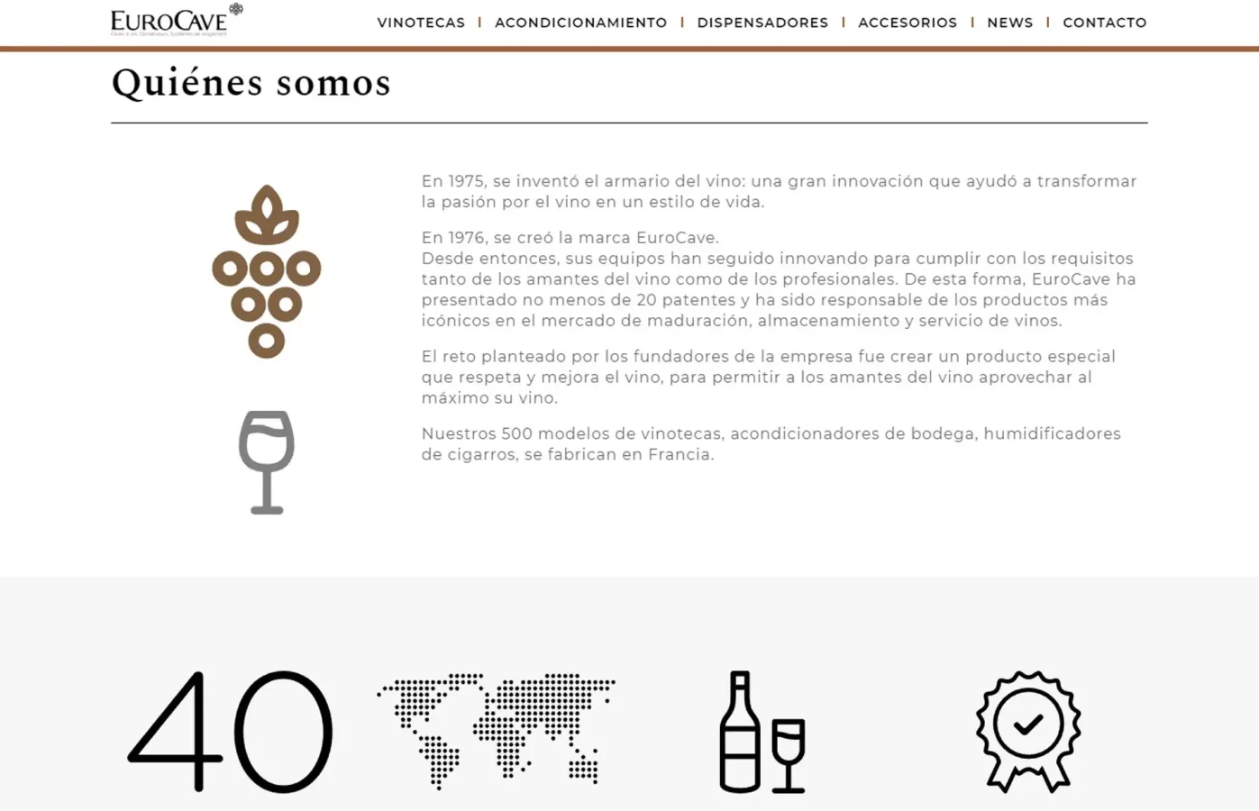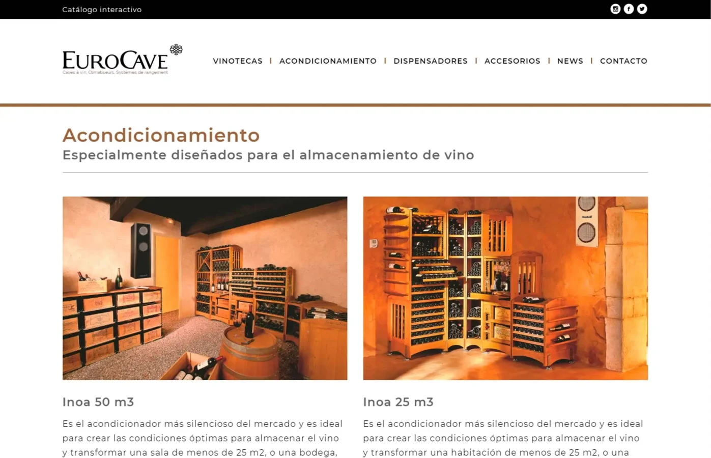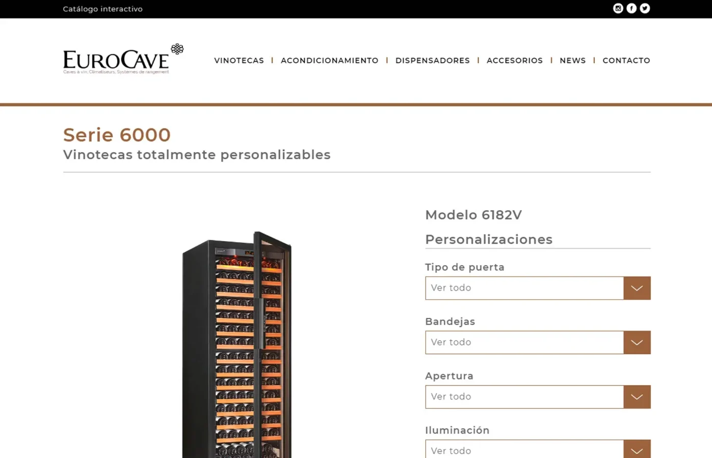 Disseny i desenvolupament web per a EuroCave, empresa pionera amb més de 40 anys d’experiència en la creació de vinoteques i solucions per al servei de vi a copes. Un projecte realitzat en col·laboració amb Bulldog Studio, amb una plataforma alineada amb el seu posicionament i enfocada a mostrar clarament productes i solucions.