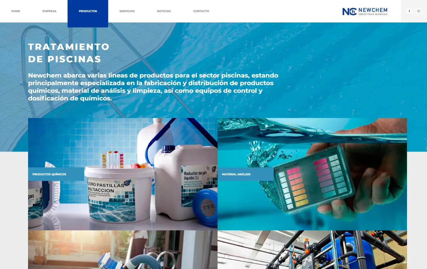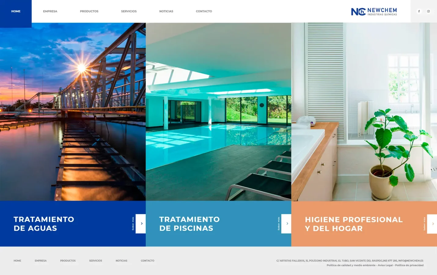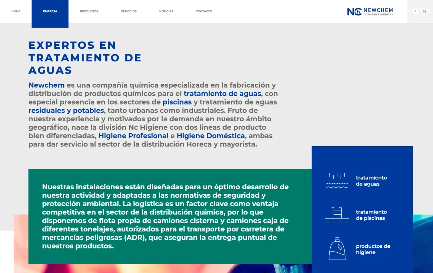 Disseny i desenvolupament web per a Newchem. Empresa química especialitzada en la fabricació i distribució de solucions per al tractament d’aigües. El projecte es concep amb un enfocament sobri i precís, i un disseny net alineat amb la seva activitat, que facilita una comunicació clara tant de l’oferta de producte com de la capacitat tècnica de l’empresa en un entorn industrial.