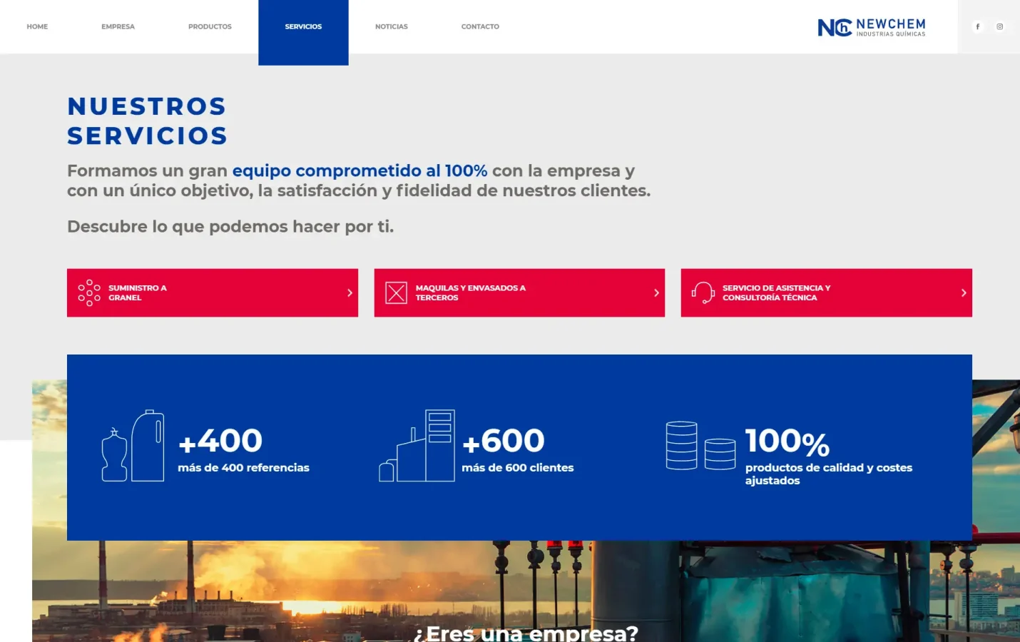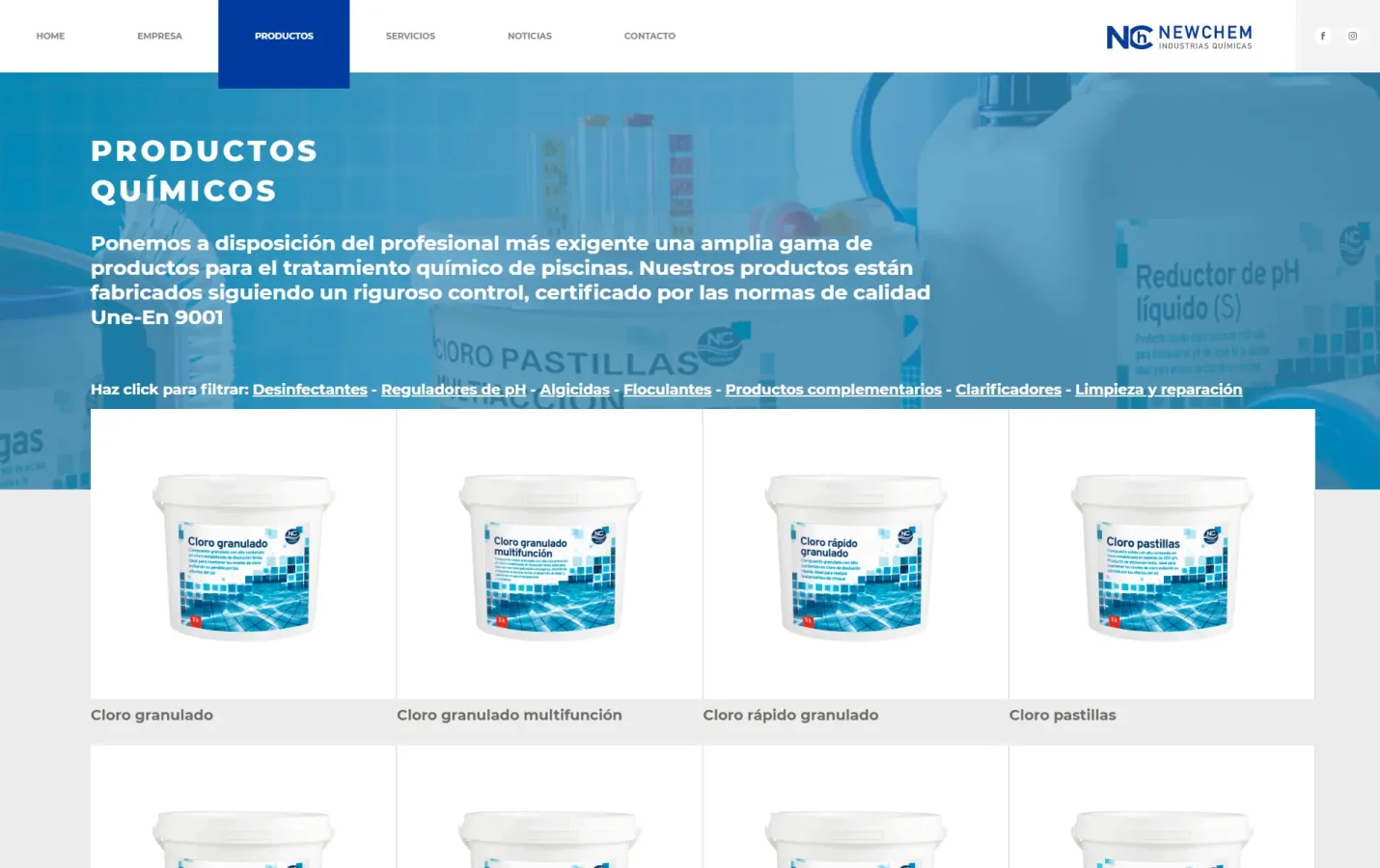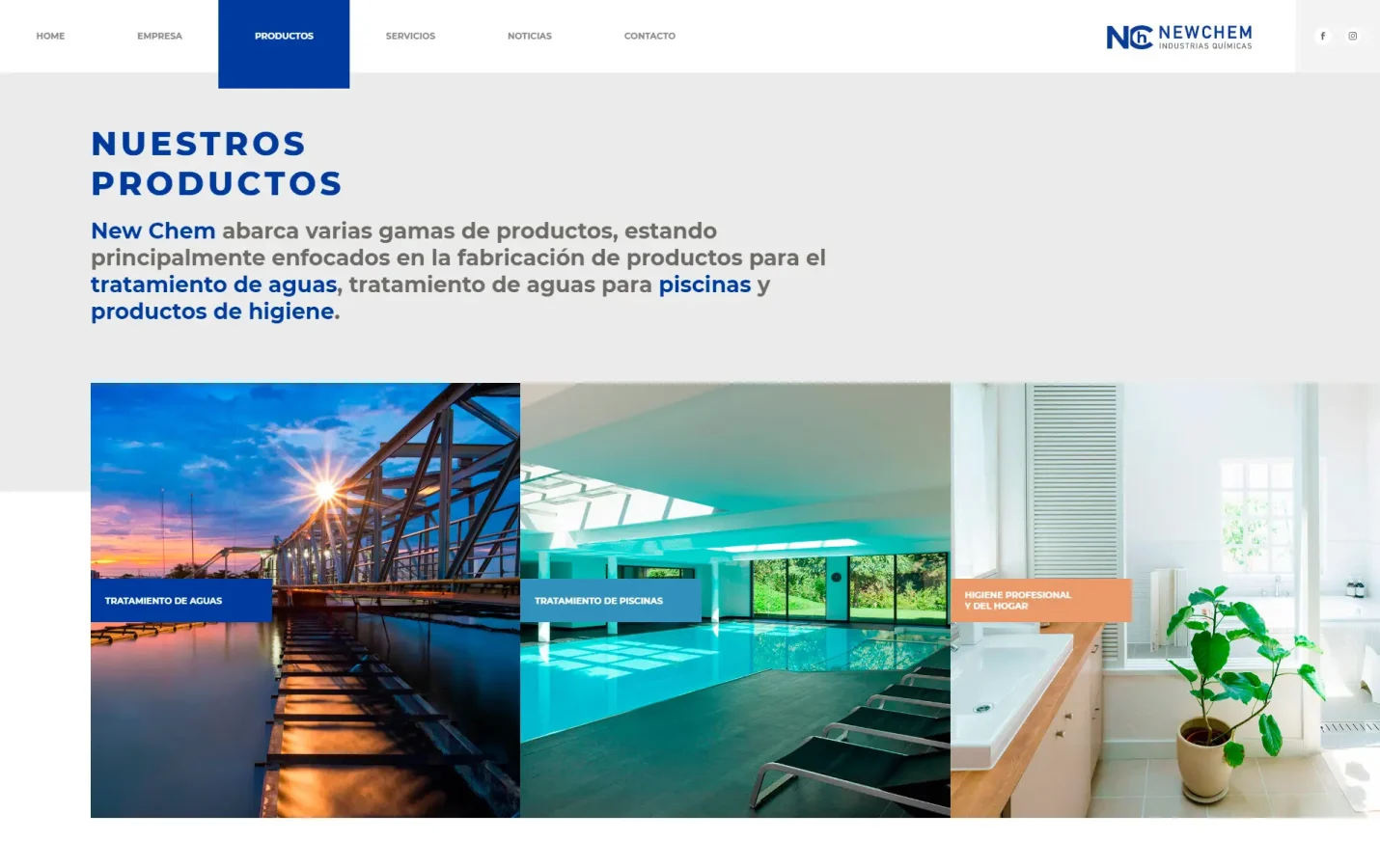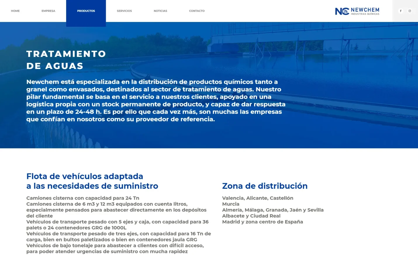 Disseny i desenvolupament web per a Newchem. Empresa química especialitzada en la fabricació i distribució de solucions per al tractament d’aigües. El projecte es concep amb un enfocament sobri i precís, i un disseny net alineat amb la seva activitat, que facilita una comunicació clara tant de l’oferta de producte com de la capacitat tècnica de l’empresa en un entorn industrial.