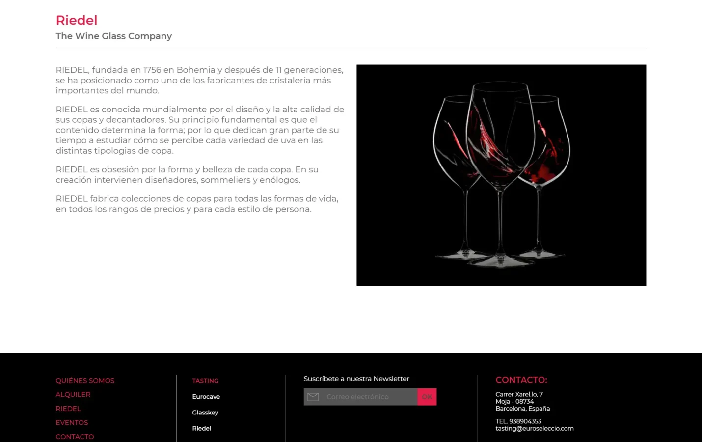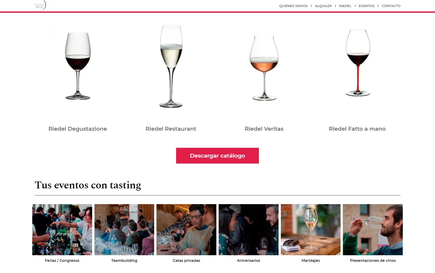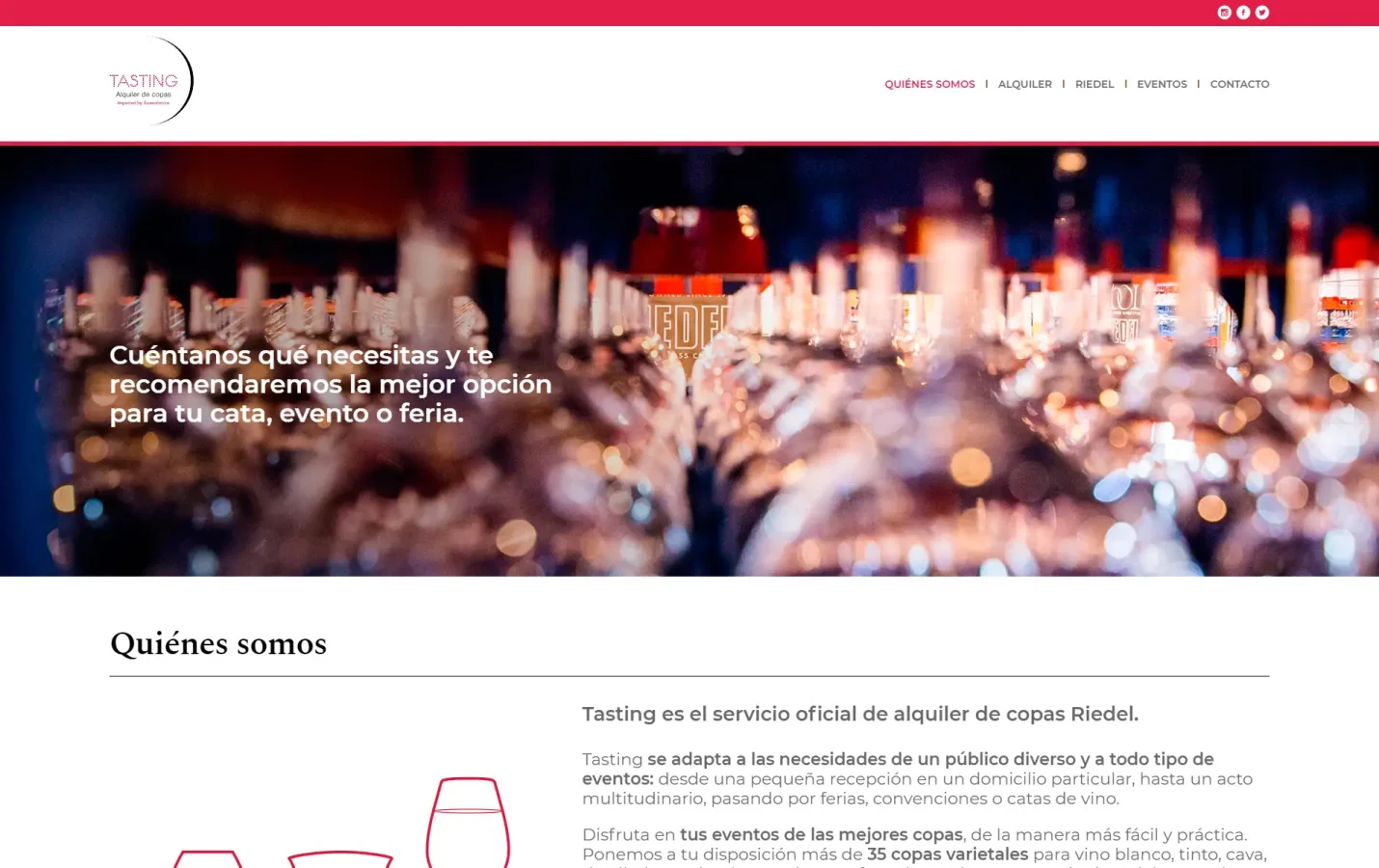 Desenvolupament web per a Tasting, servei oficial de lloguer de copes Riedel. Projecte realitzat en col·laboració amb Bulldog Studio, responsable del disseny, implementant una plataforma clara i funcional enfocada a presentar el servei i la seva operativa.